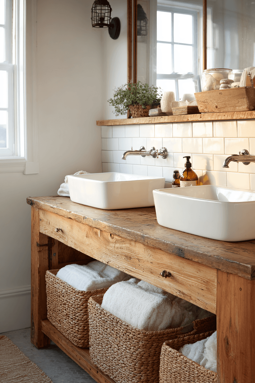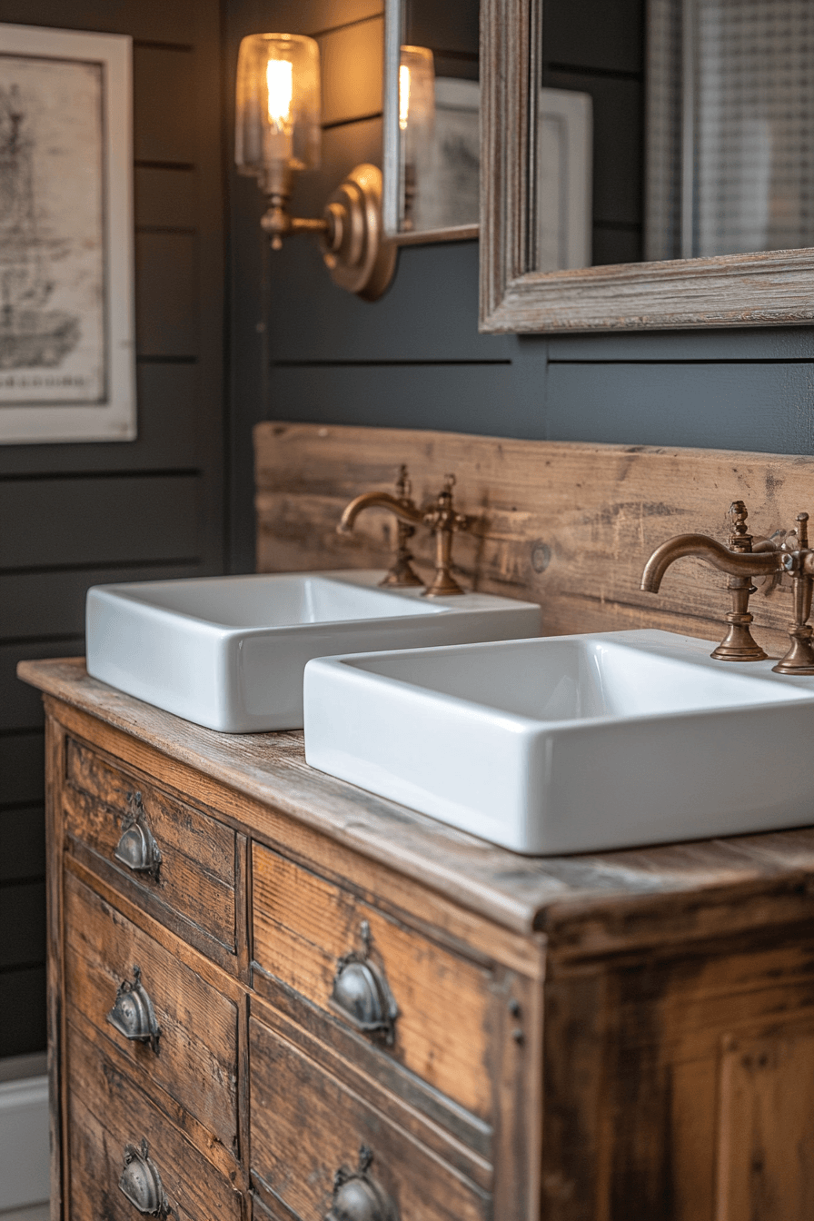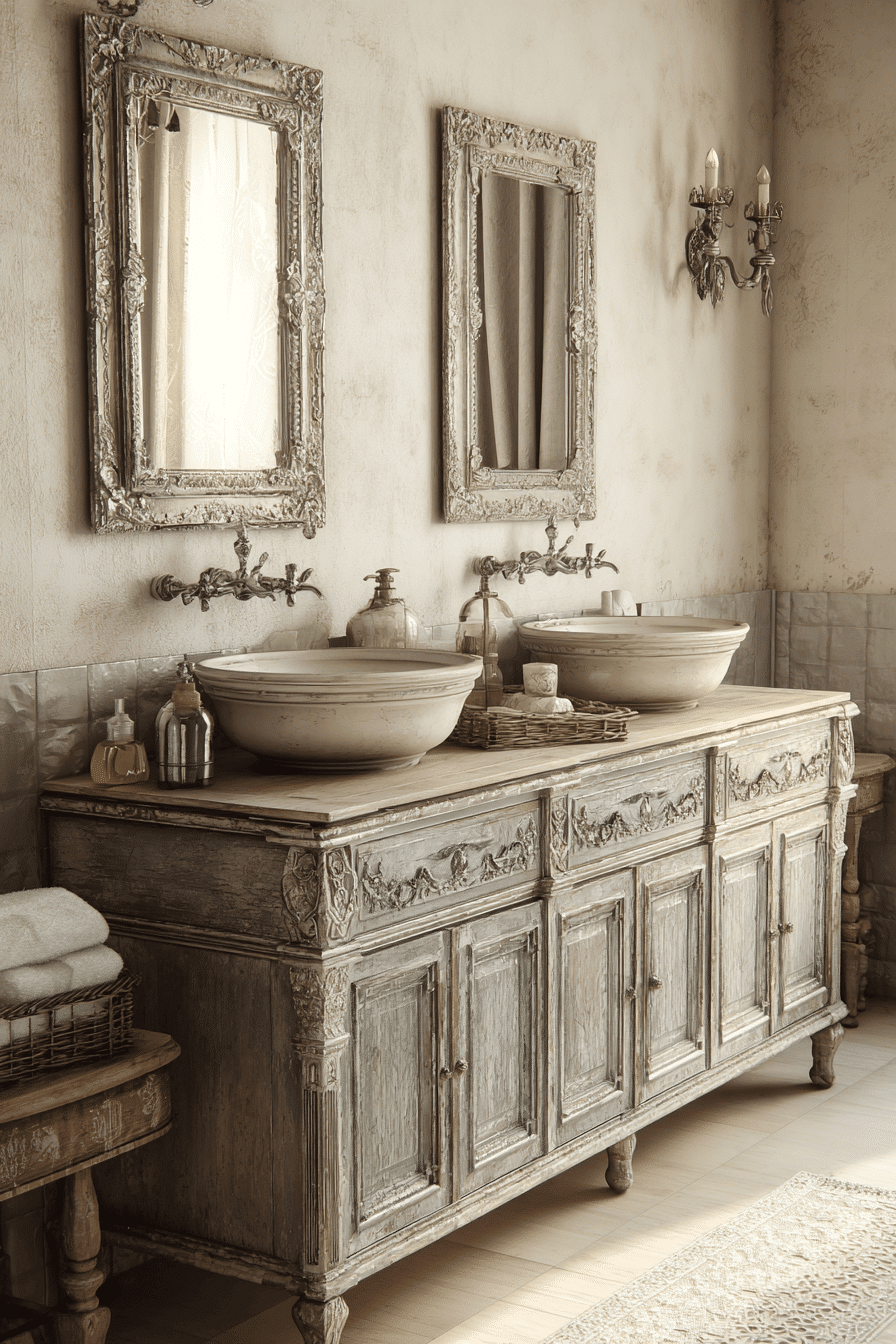 Repurposed furniture creates a double sink bathroom vanity full of unique character and charm. Reclaimed materials add history and personality. This double sink bathroom vanity blends vintage appeal with modern use. Each piece feels one-of-a-kind. The space feels warm and personal. Add a distinctive feature to your bathroom.