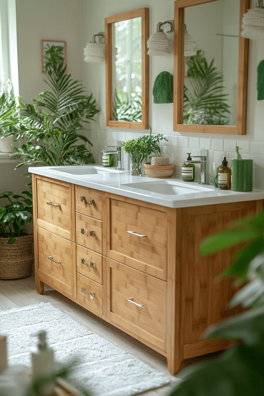 Sustainable materials shape a double sink bathroom vanity that feels natural and calming. Bamboo and eco-friendly finishes add warmth and texture. This double sink bathroom vanity blends modern design with environmental awareness. Clean lines highlight the organic look. The space feels fresh and grounded. Choose eco-friendly style for your bathroom.