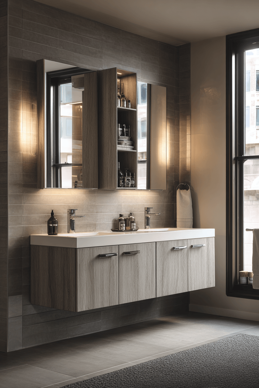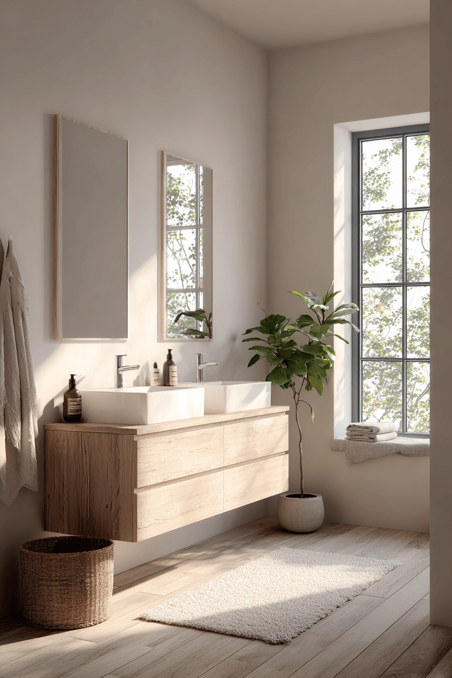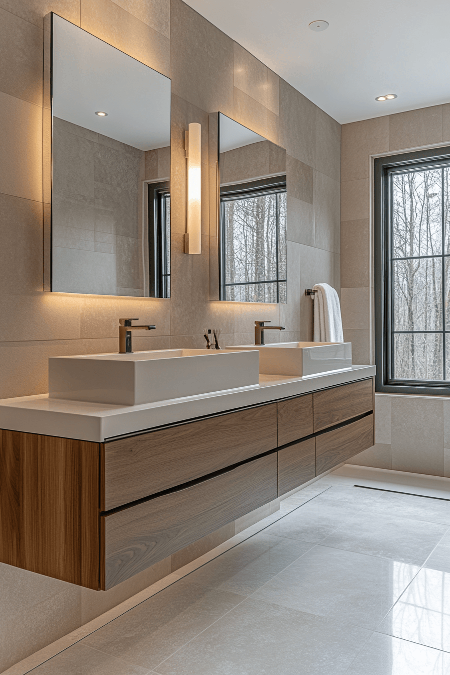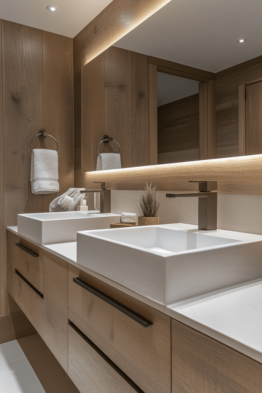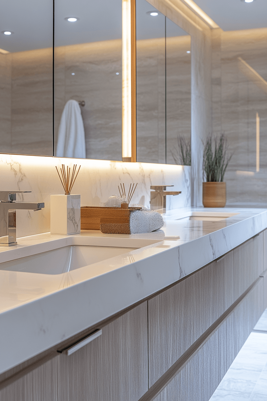 A double sink bathroom vanity transforms your daily routine by offering shared space, enhanced storage, and a sophisticated focal point that elevates the entire room. Whether you’re drawn to sleek modern lines, warm natural textures, or bold statement finishes, the right vanity design can perfectly balance function and style. From floating installations that create an airy feel to custom builds tailored to your exact needs, these 27 double sink bathroom vanity ideas showcase diverse approaches to creating a beautiful, practical space. Explore designs featuring everything from eco-friendly bamboo and polished stone to smart technology and mixed materials, each offering a unique way to refresh your bathroom with both elegance and everyday convenience.