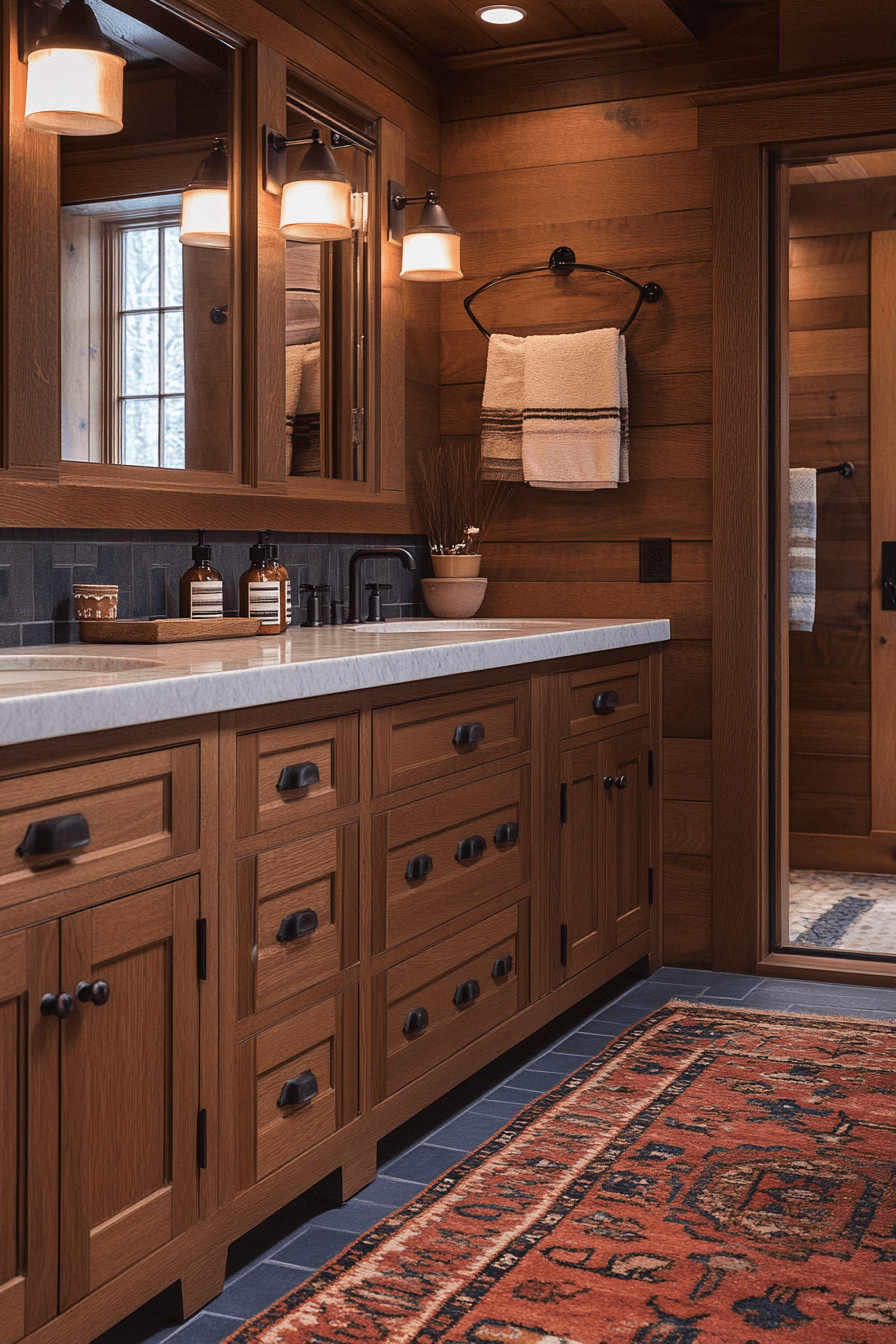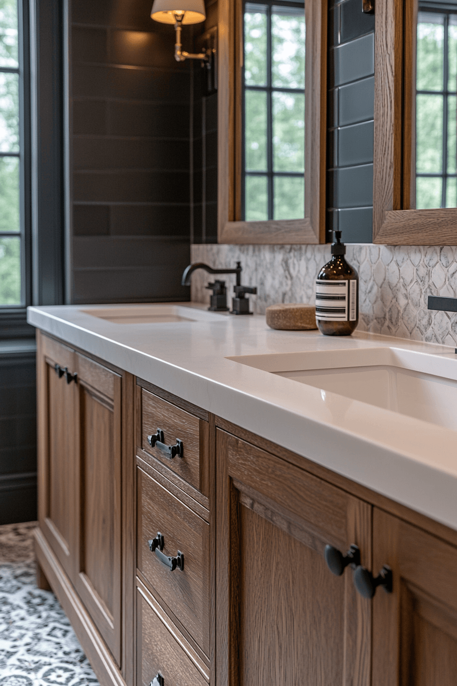 Craftsman construction creates a double sink bathroom vanity with timeless quality and durability. Solid wood and detailed joinery add strength. This double sink bathroom vanity feels authentic and well-built. Warm tones enhance its charm. The space feels grounded and classic. Add craftsmanship to your bathroom.