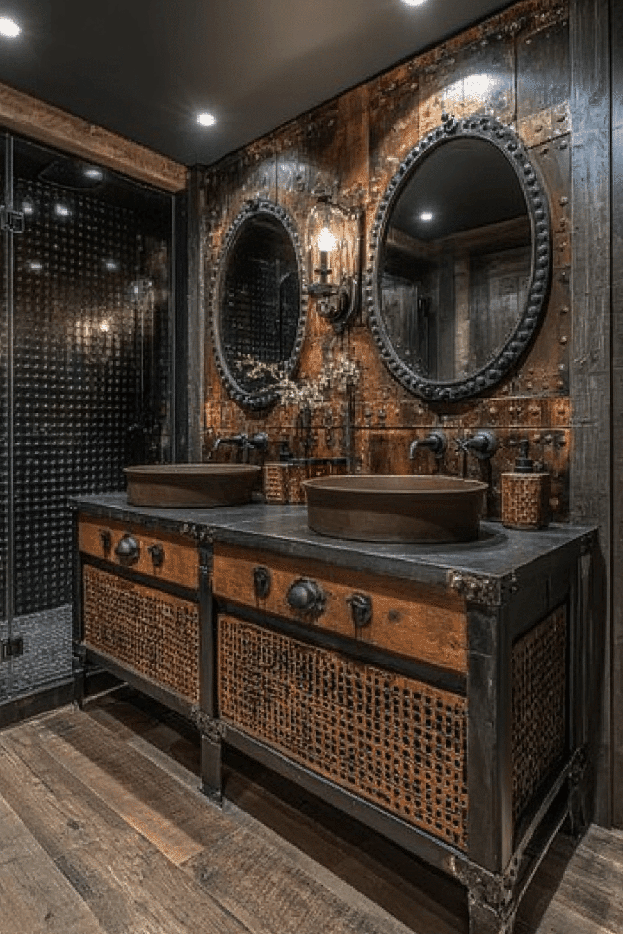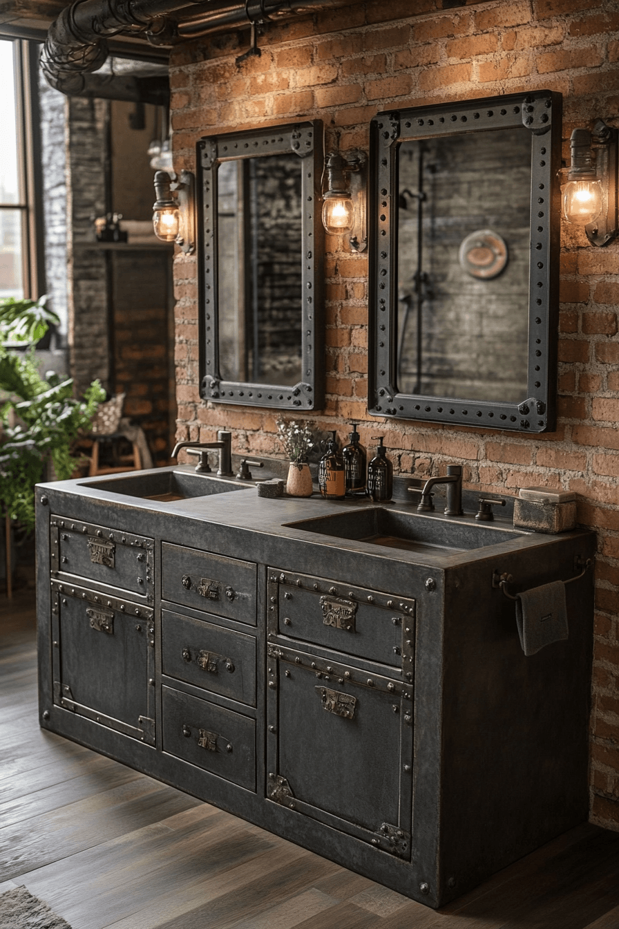 Bold industrial elements define a double sink bathroom vanity with strong lines and rugged texture. Metal frames and raw finishes add structure and edge. This double sink bathroom vanity often features open shelving for added function. The design feels modern and practical. It works beautifully in larger layouts. Add an industrial statement to your bathroom.