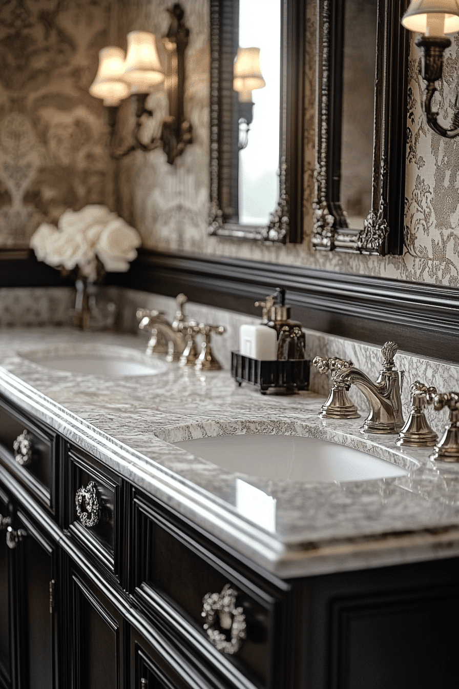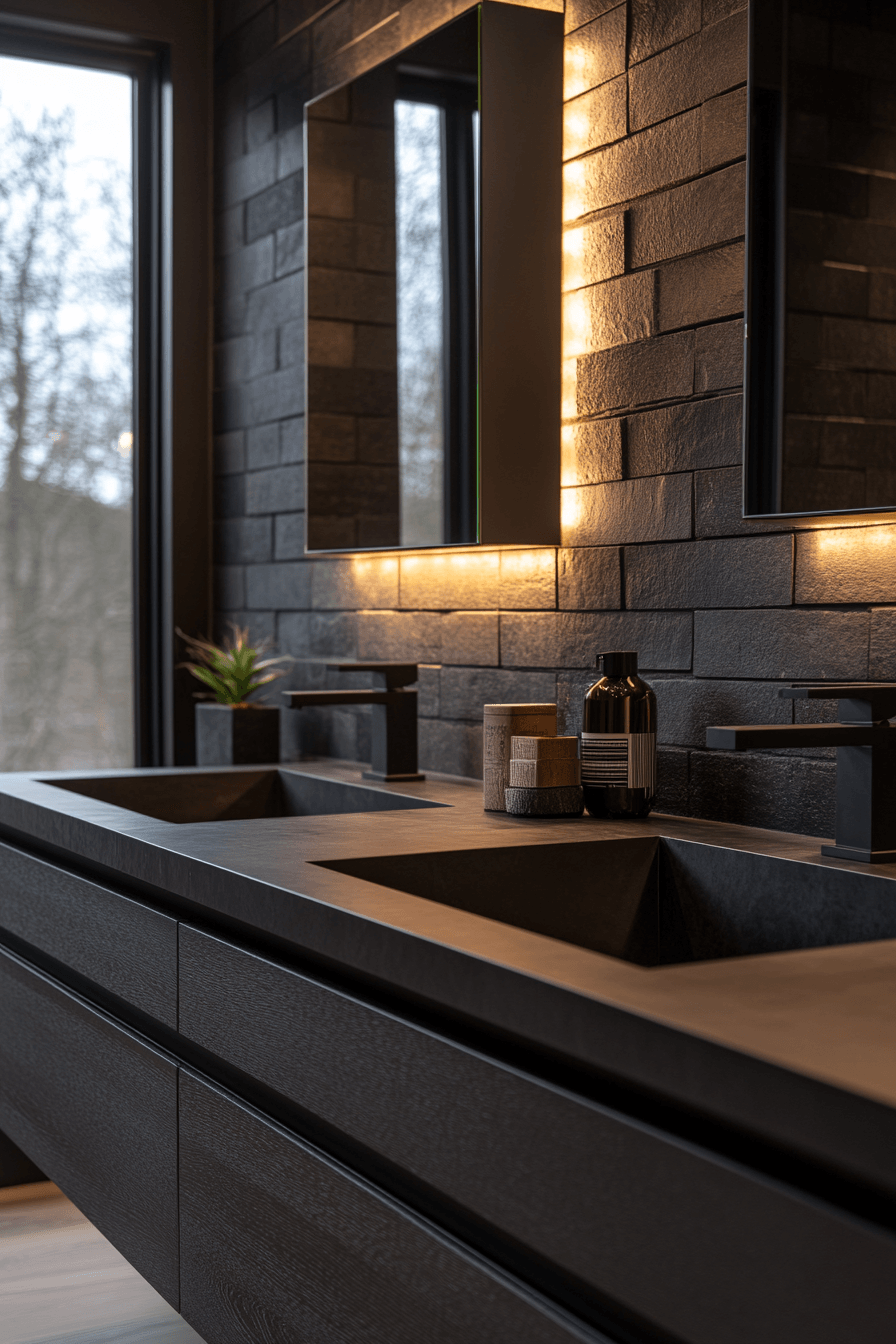 A deep, dramatic tone turns a double sink bathroom vanity into a bold focal point. The rich color adds contrast and anchors the room. This double sink bathroom vanity often features modern lines and hardware. It creates a sophisticated and eye-catching design. The overall feel is confident and stylish. Make a bold statement in your bathroom.