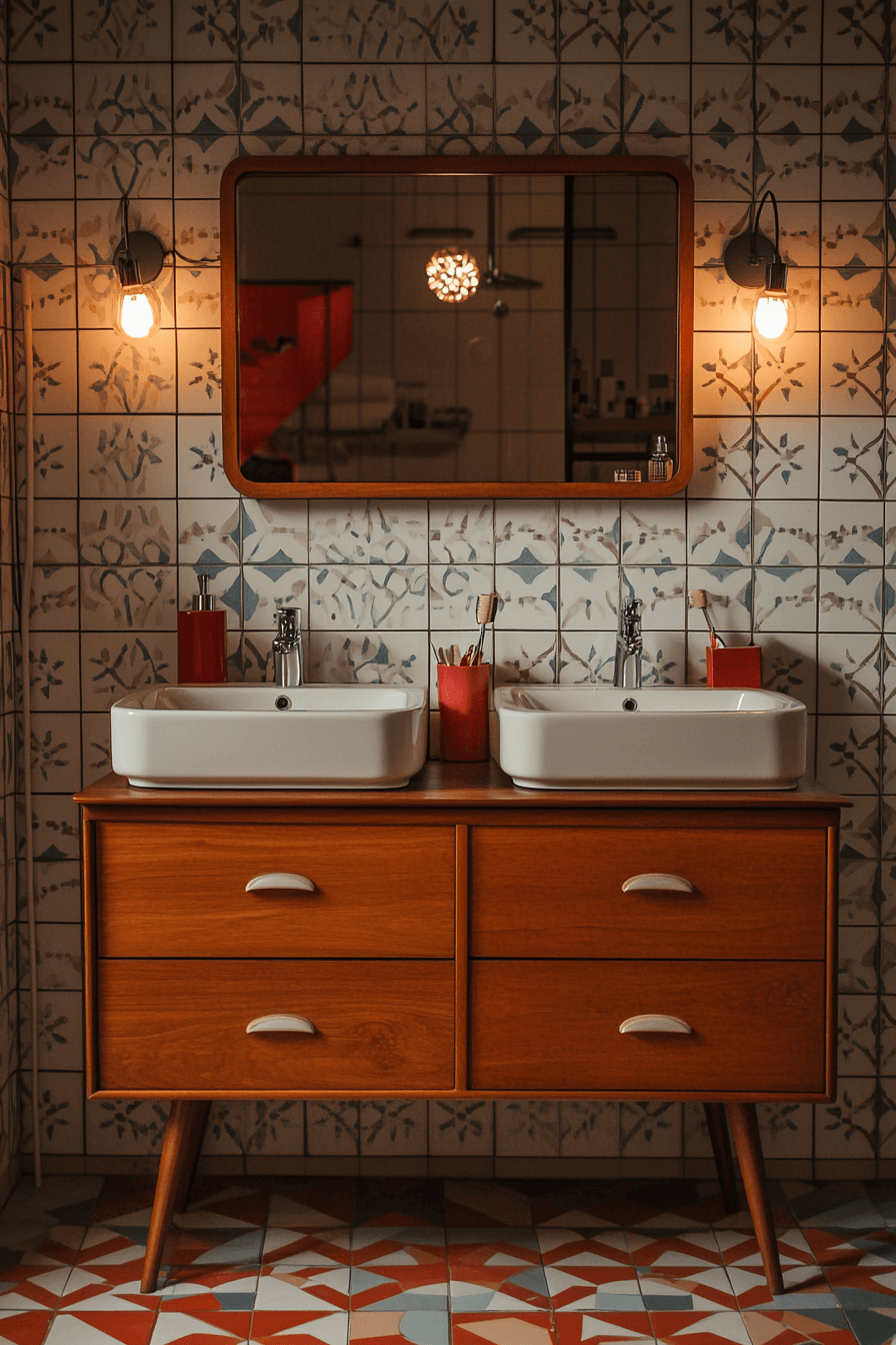 Mid-century influence shapes a double sink bathroom vanity with smooth curves and warm tones. Tapered legs and simple forms create a light, stylish look. This double sink bathroom vanity blends retro charm with modern function. Subtle hardware keeps everything balanced. The space feels playful yet refined. Add vintage-inspired style to your bathroom.