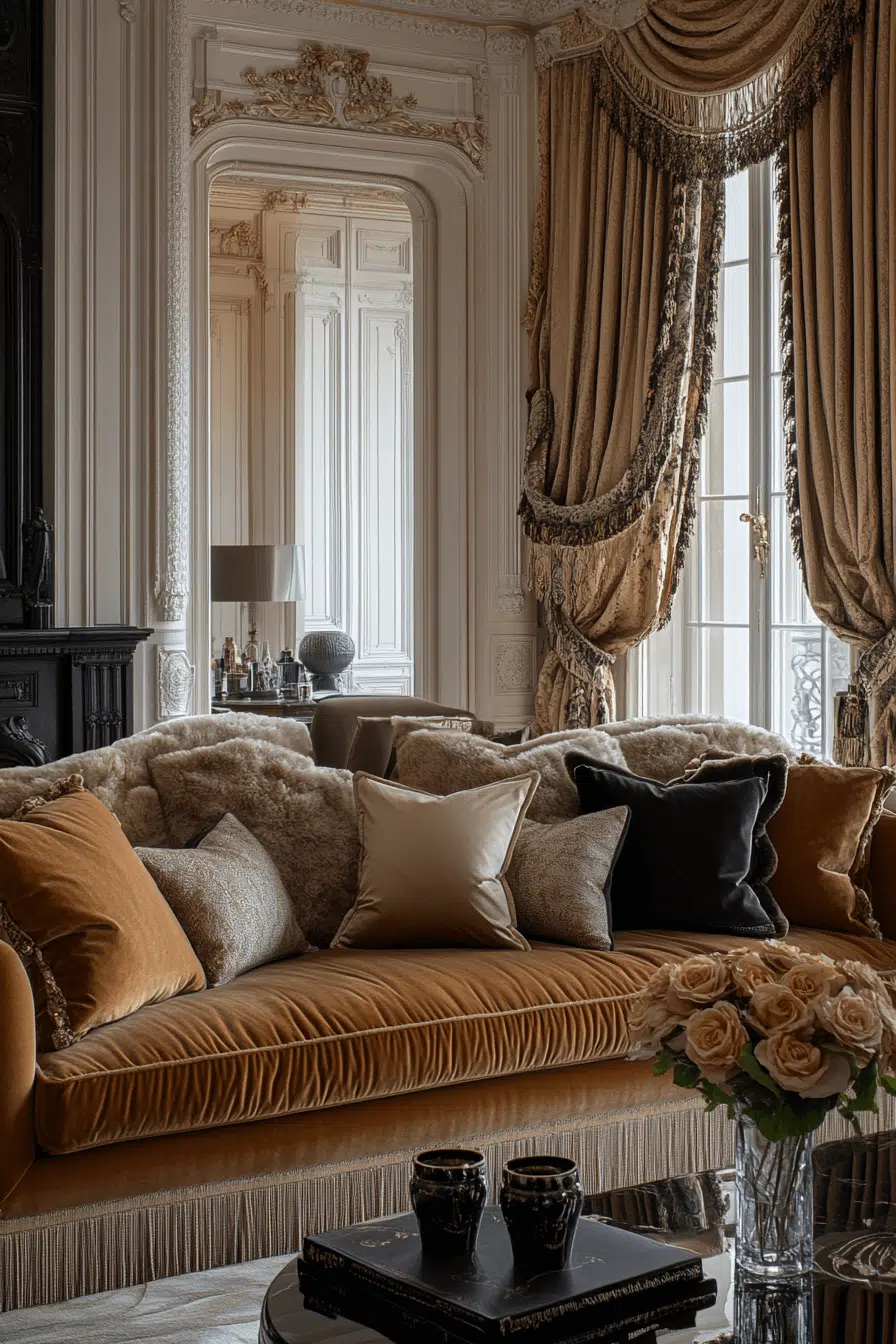 Sink into plush velvet seats, a dreamy delight in elegant living room decor. Affordable velvet cushions or a thrifted chair bring rich texture and a royal feel without the cost. This fabric adds a cozy, upscale vibe that’s perfect for lounging or hosting.