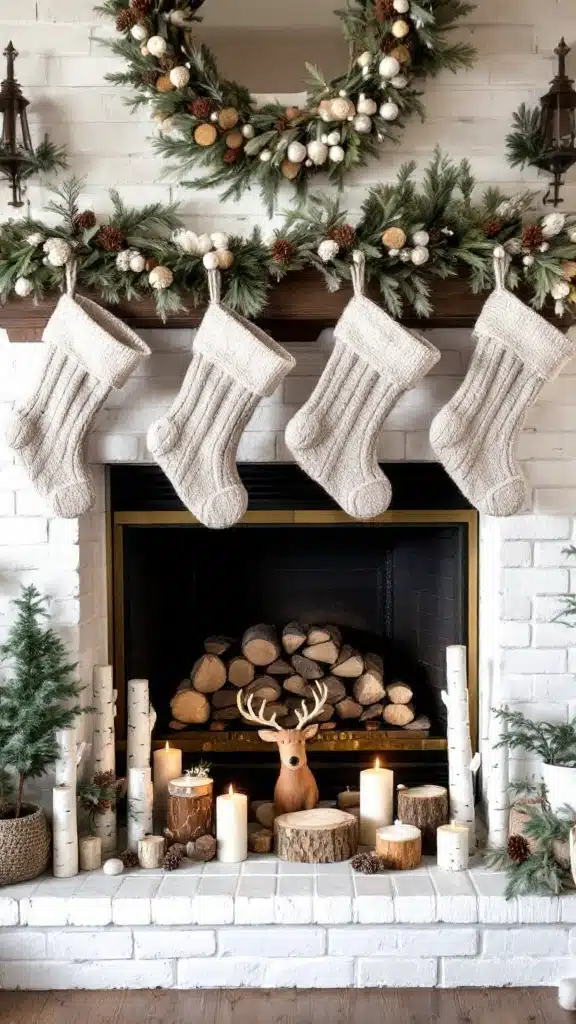 Rustic Woodland Charm comes to life with a fireplace adorned in natural wood garlands, charming miniature pinecones, and stacked faux birch logs, creating an earthy and inviting ambiance. The neutral-toned knitted stockings add softness, while a reindeer figurine serves as the perfect rustic centerpiece.