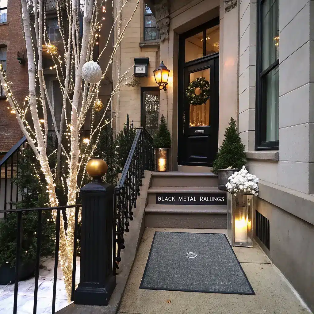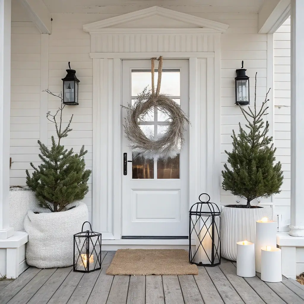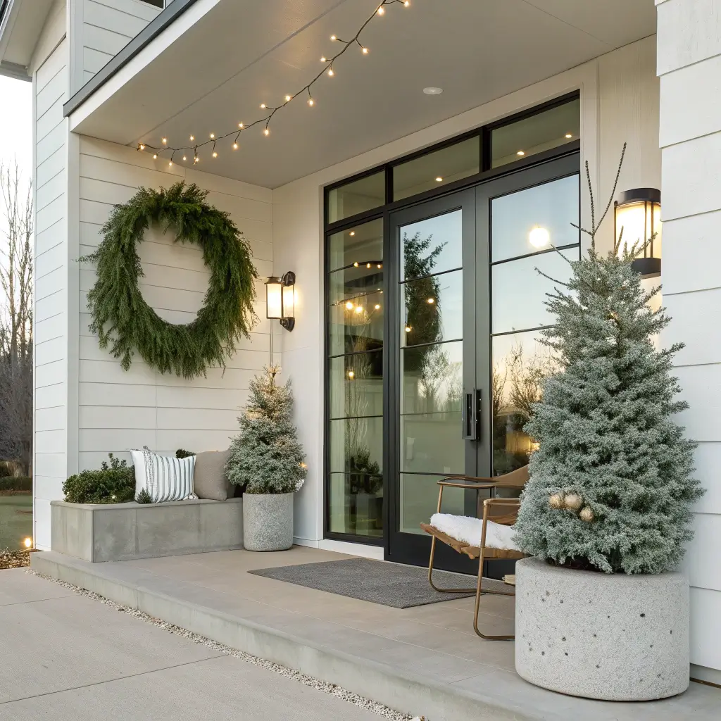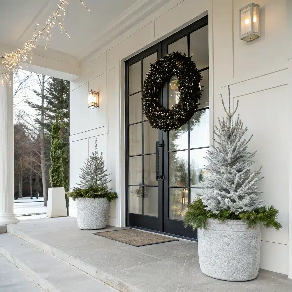 I frame the doorway with garlands on railings or columns. I flank my door with planters filled with evergreens, branches, or small trees.