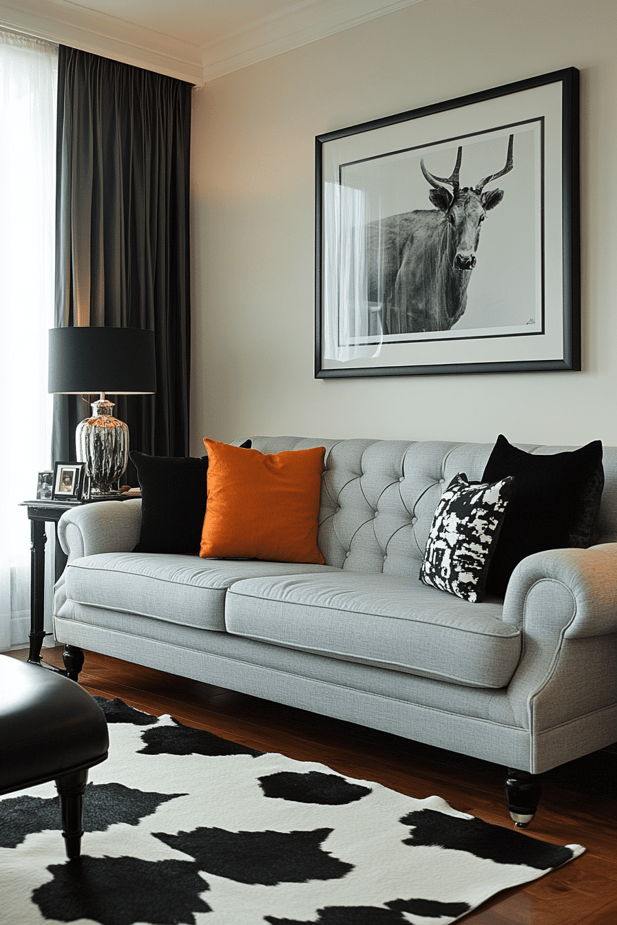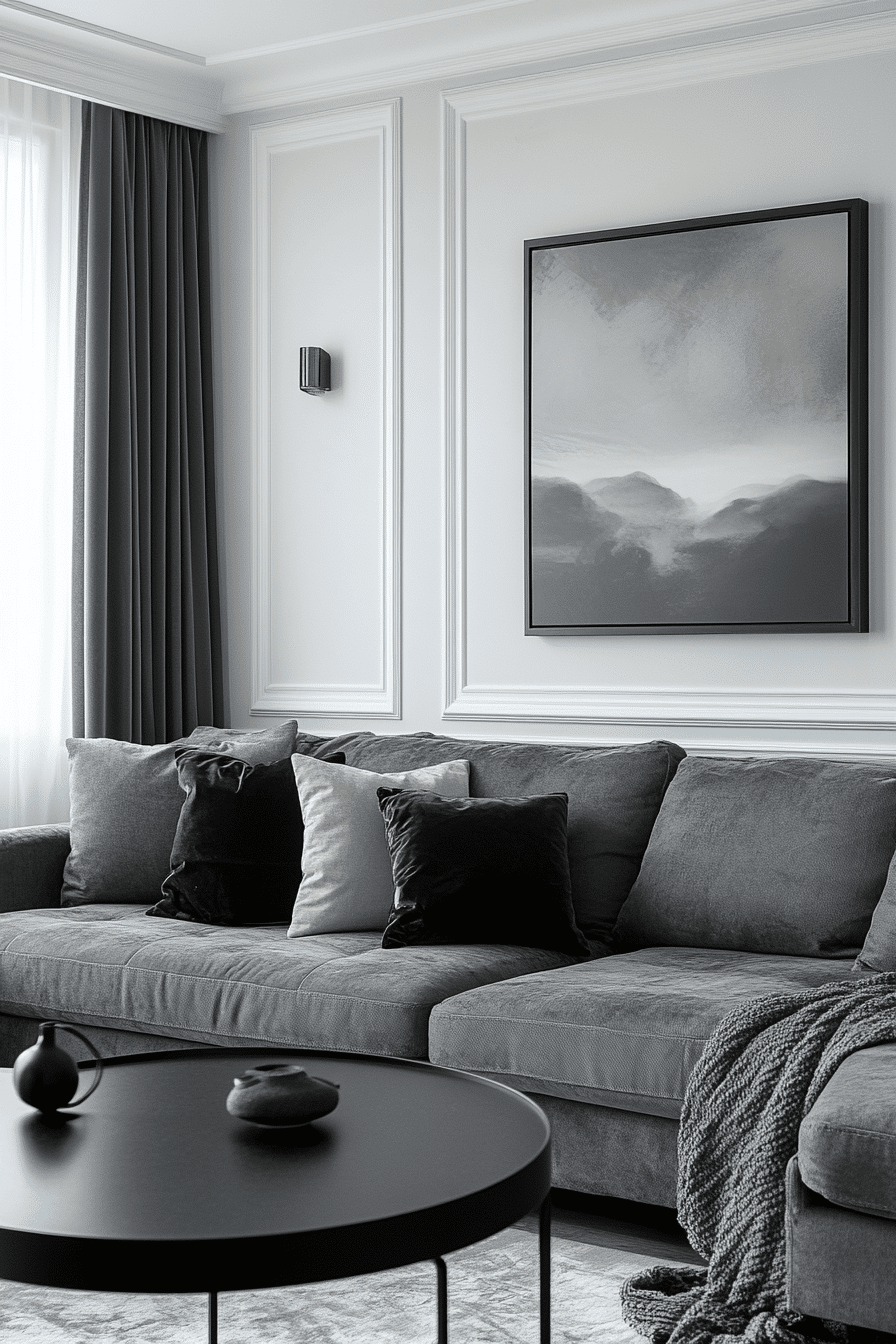 Create a dramatic look with a grey couch living room built around high-contrast styling. Dark accents highlight the couch while keeping the design sleek. Clean-lined furniture ensures the space stays organized. The contrast adds depth and modern appeal. The room feels bold and polished. Redefine your space with these grey couch living room ideas.