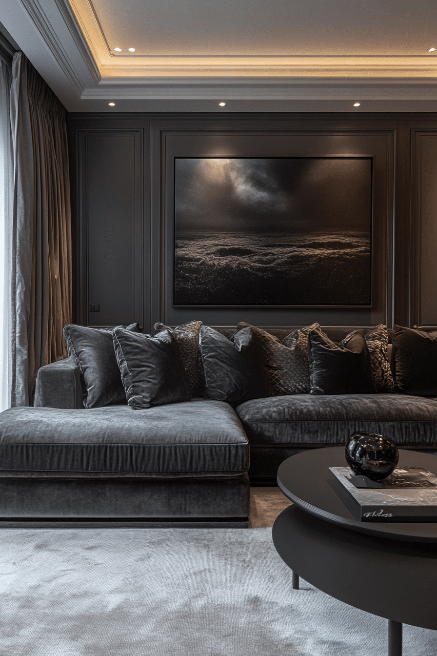 Add bold sophistication with a grey couch living room featuring deep, rich tones. Jewel-inspired accents create striking contrast. The grey couch balances the palette effortlessly. Metallic finishes enhance the elegant feel. The room feels dramatic and refined. Make a statement with these grey couch living room ideas.