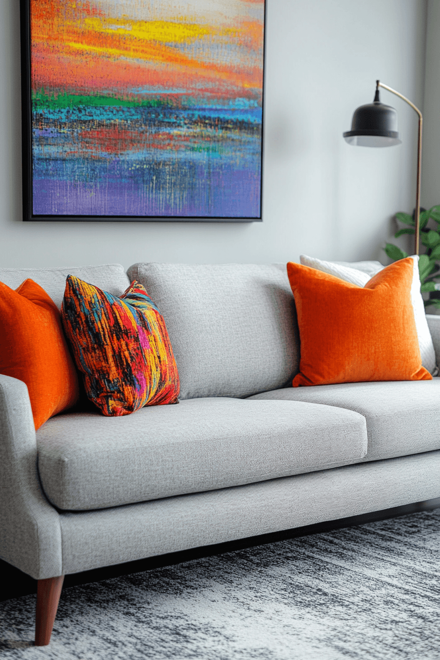 Bring energy into your design with a grey couch living room accented by vibrant color pops. Bright tones add life and personality to the neutral base. The grey couch balances the bold elements beautifully. Soft textures keep the look cozy and inviting. The result feels lively and stylish. Energize your space with these grey couch living room ideas.