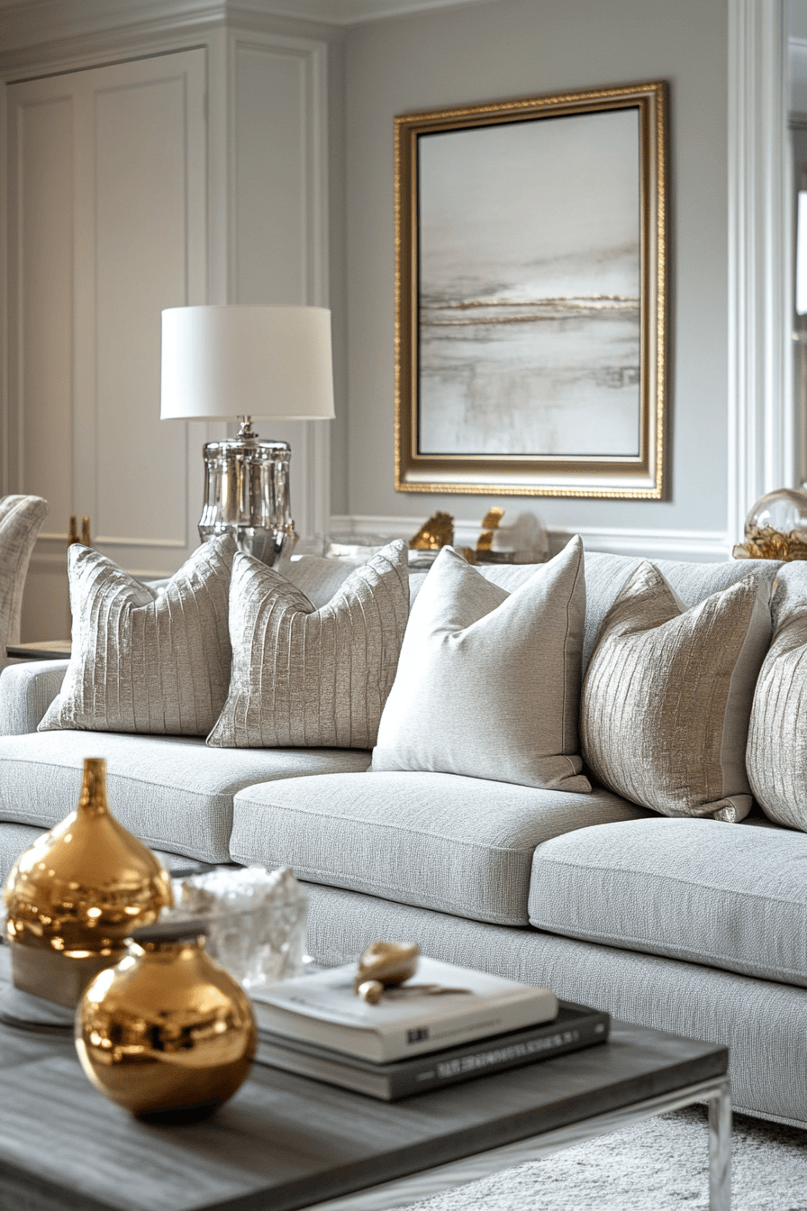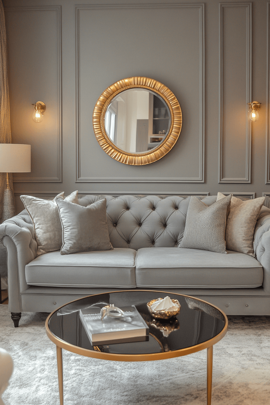 Introduce refined elegance with a grey couch living room styled with metallic accents for a soft glow. The grey couch pairs beautifully with gold or brushed finishes. Reflective elements help bounce light throughout the space. The design feels polished yet comfortable for everyday living. The result is both stylish and inviting. Elevate your decor with these grey couch living room ideas.
