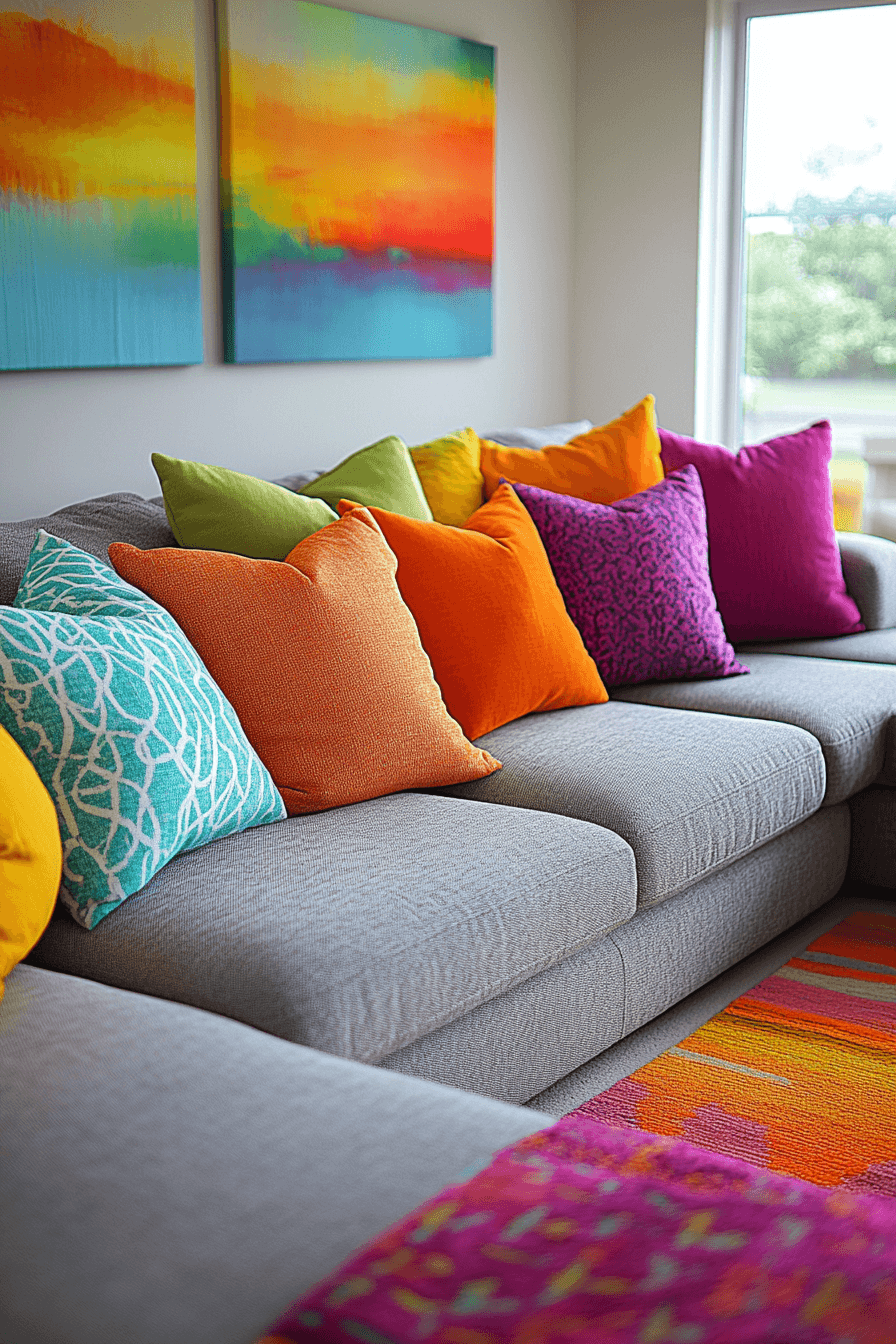 Create a fun, lively space with a grey couch living room featuring playful color accents. Bright decor elements contrast beautifully with the neutral couch. The grey couch keeps the design grounded. Soft textures add comfort and warmth. The room feels cheerful and welcoming. Bring energy into your home with these grey couch living room ideas.