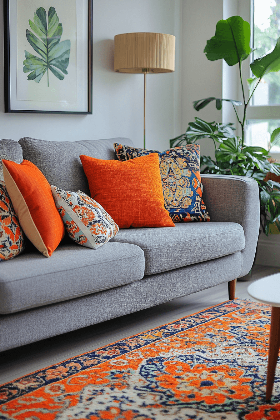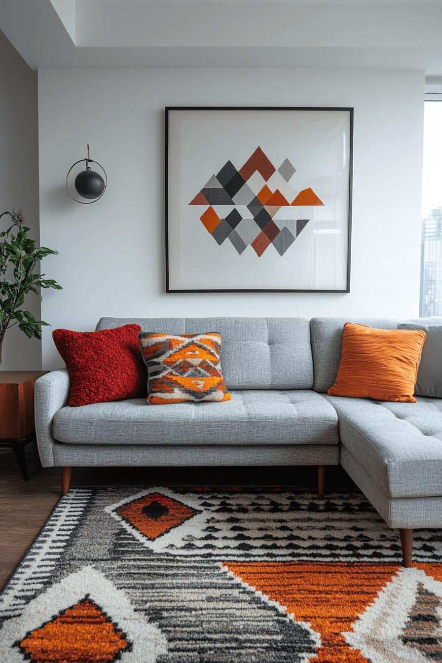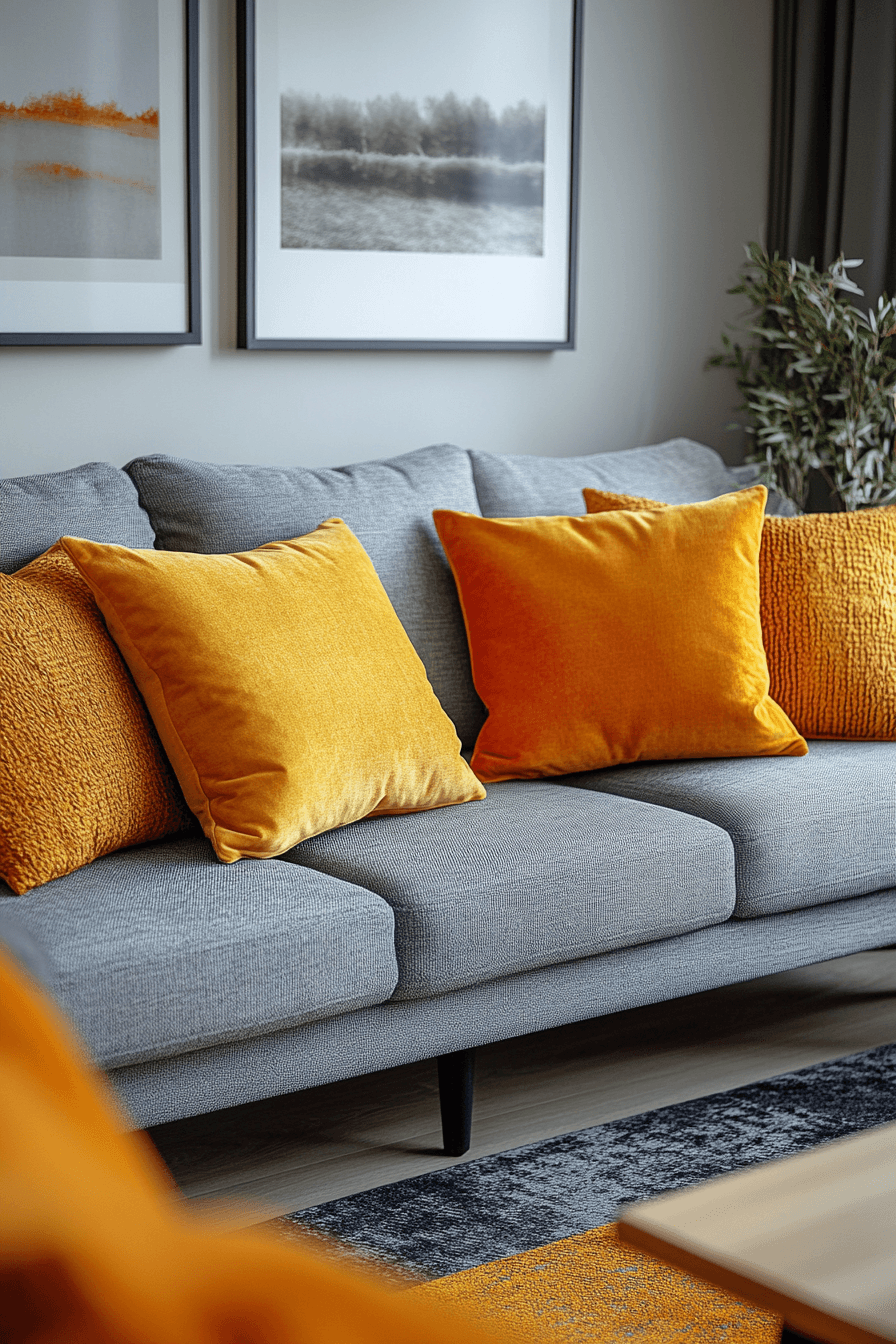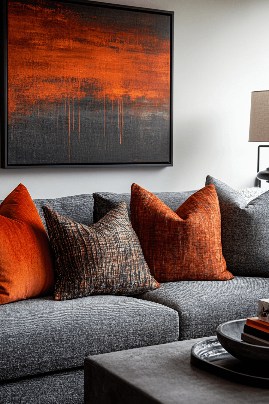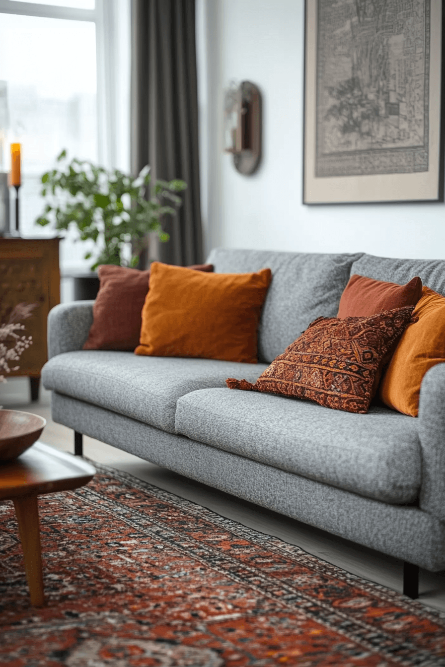 Add warmth and personality to your space with a grey couch living room enriched by earthy tones. Colors like clay, rust, and deep amber create beautiful contrast. The grey couch provides a neutral base that grounds the palette. Wooden elements and warm lighting enhance the cozy feel. The result feels dynamic yet welcoming. Bring character into your home with these grey couch living room ideas.