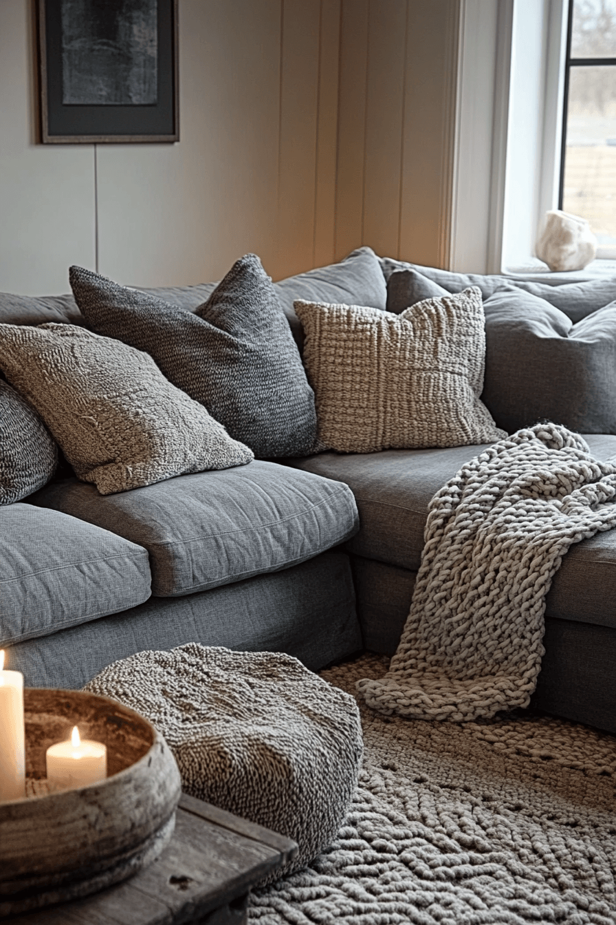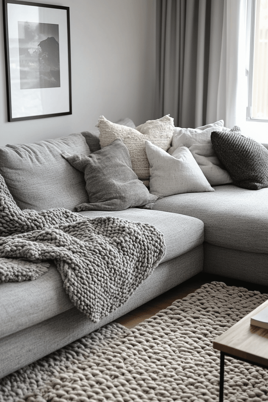 Build a cozy atmosphere with a grey couch living room layered in rich textures and fabrics. Materials like wool, velvet, and linen create depth. The grey couch becomes the focal point. Rugs and soft finishes enhance comfort. The room feels warm and inviting. Add texture to your design with these grey couch living room ideas.