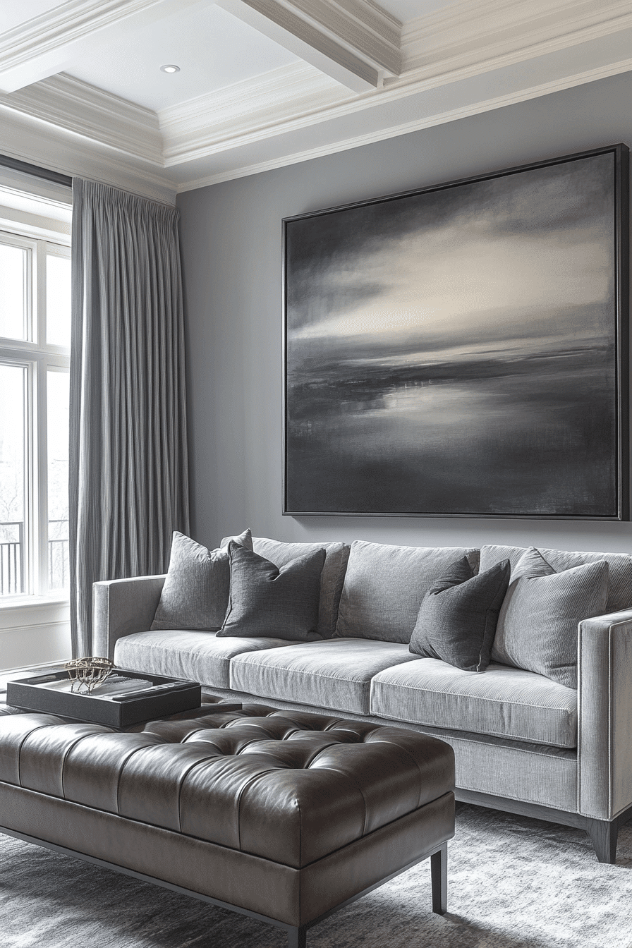 Mix materials beautifully with a grey couch living room that blends leather and fabric accents. The grey couch pairs perfectly with sleek leather pieces. Wooden details bring warmth and balance. The contrast creates a refined look. The space feels grounded and stylish. Discover new combinations with these grey couch living room ideas.