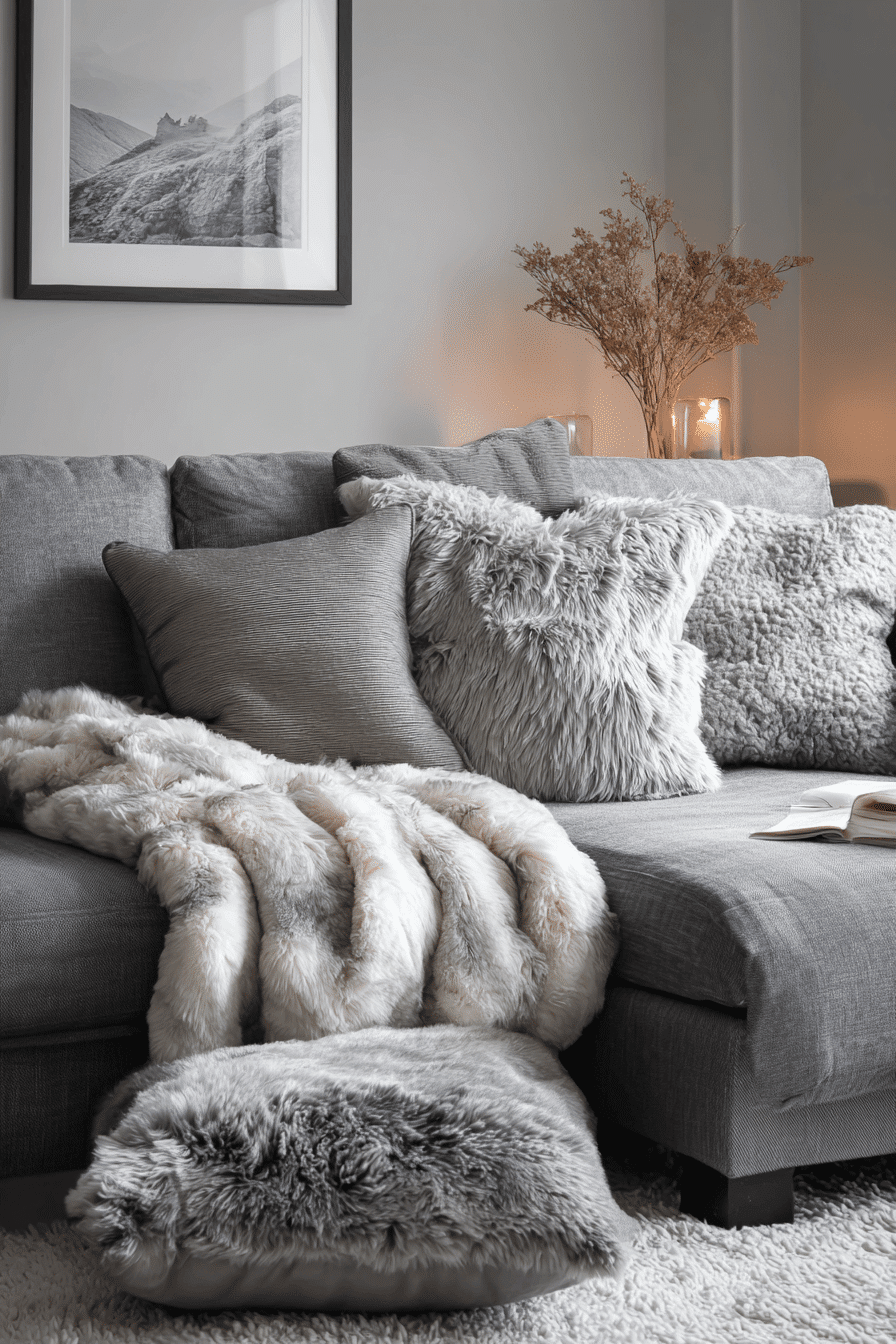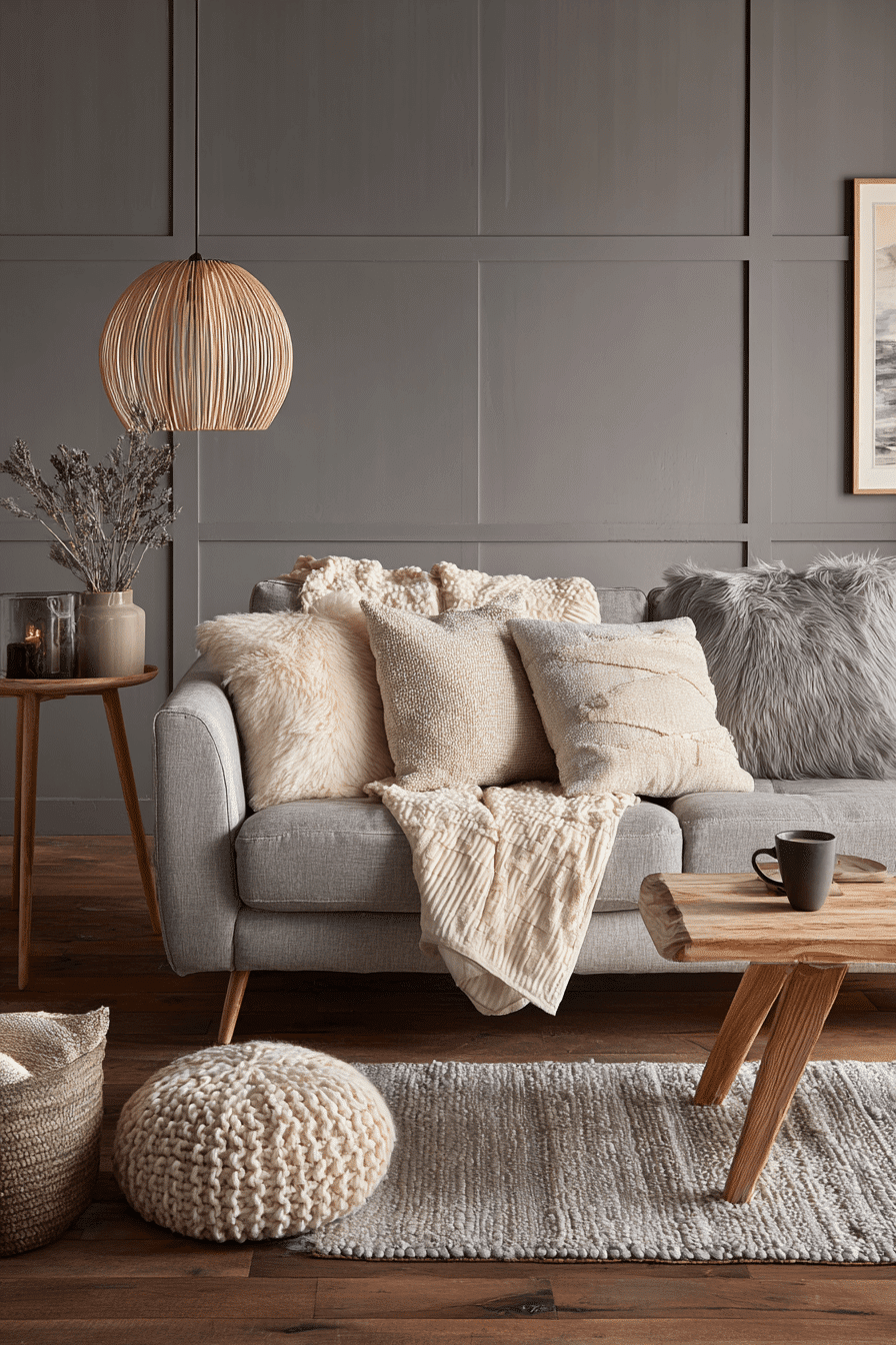 Create a relaxing retreat with a grey couch living room filled with soft layers and cozy textures. Cushions and throws add comfort and depth. The grey couch anchors the inviting design. A plush rug enhances the warmth. The space feels calm and soothing. Relax in style with these grey couch living room ideas.
