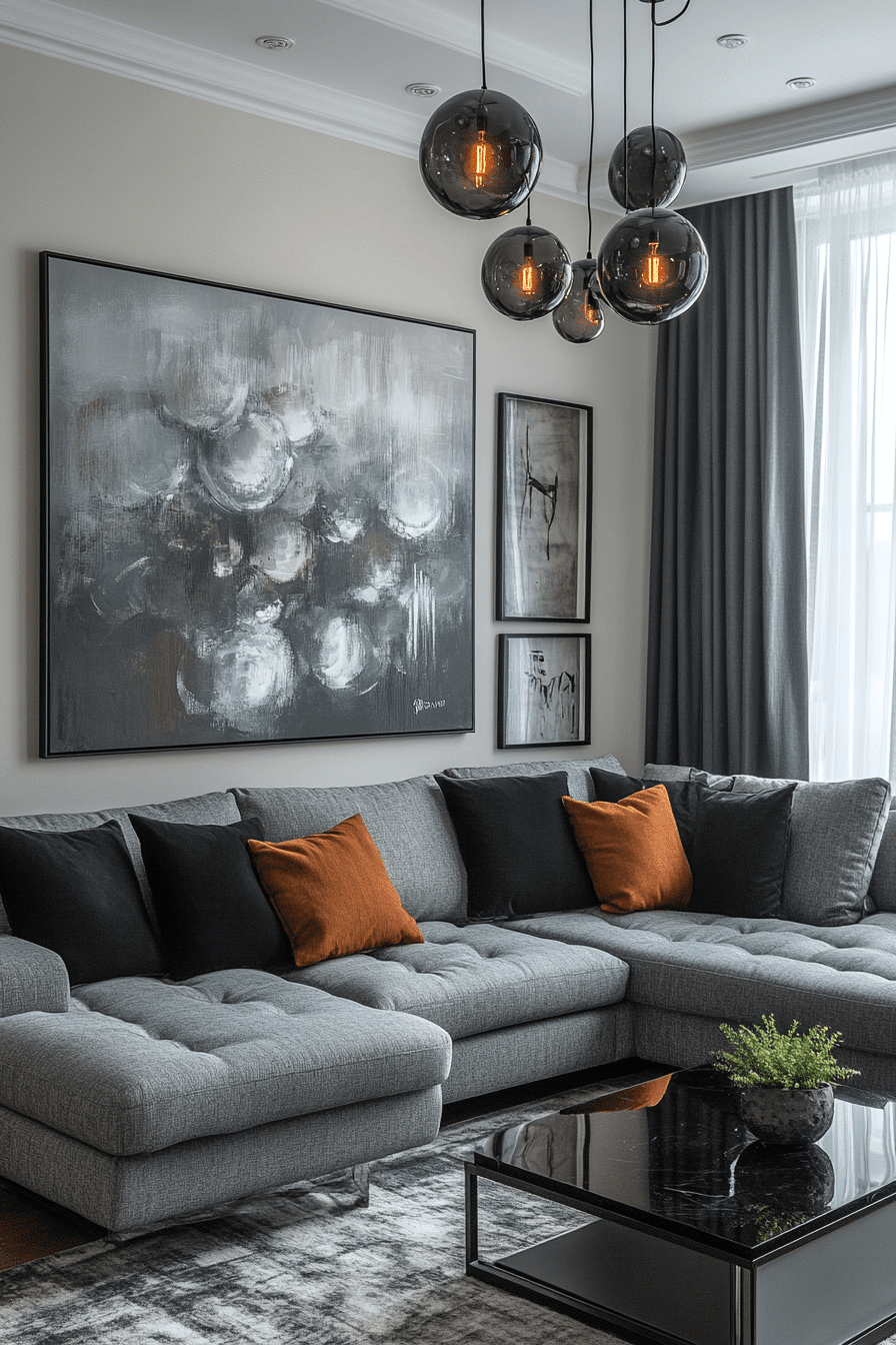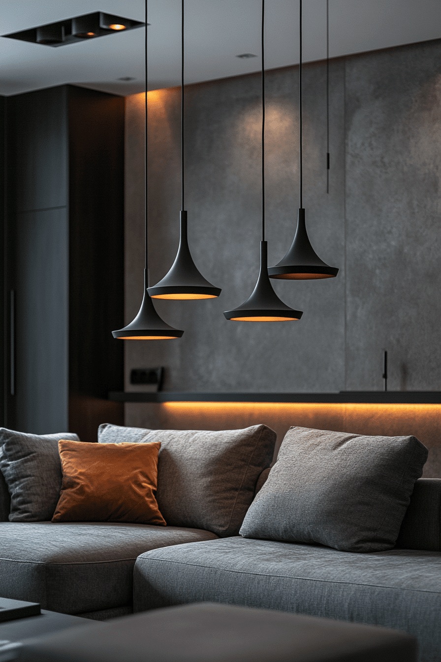 Highlight your layout with a grey couch living room enhanced by layered lighting. Statement fixtures draw attention to the seating area. The grey couch stands out under soft illumination. Simple decor keeps the space uncluttered. The room feels bright and inviting. Light up your space with these grey couch living room ideas.