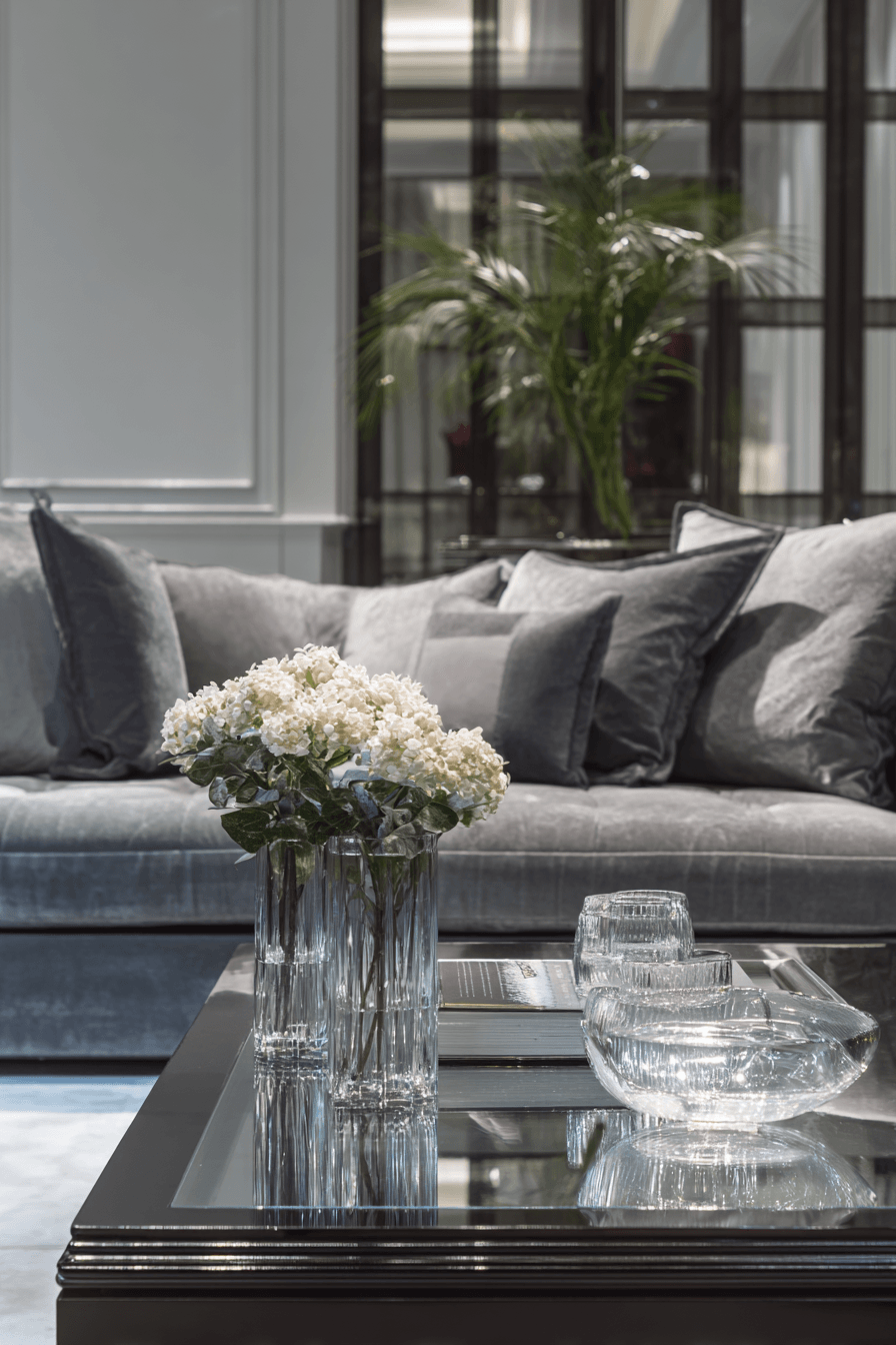 Brighten your space with a grey couch living room styled using reflective finishes. Glass tables and sleek decor enhance light flow. The grey couch integrates seamlessly into the design. The space feels open and modern. The overall look is polished and fresh. Refresh your home with these grey couch living room ideas.