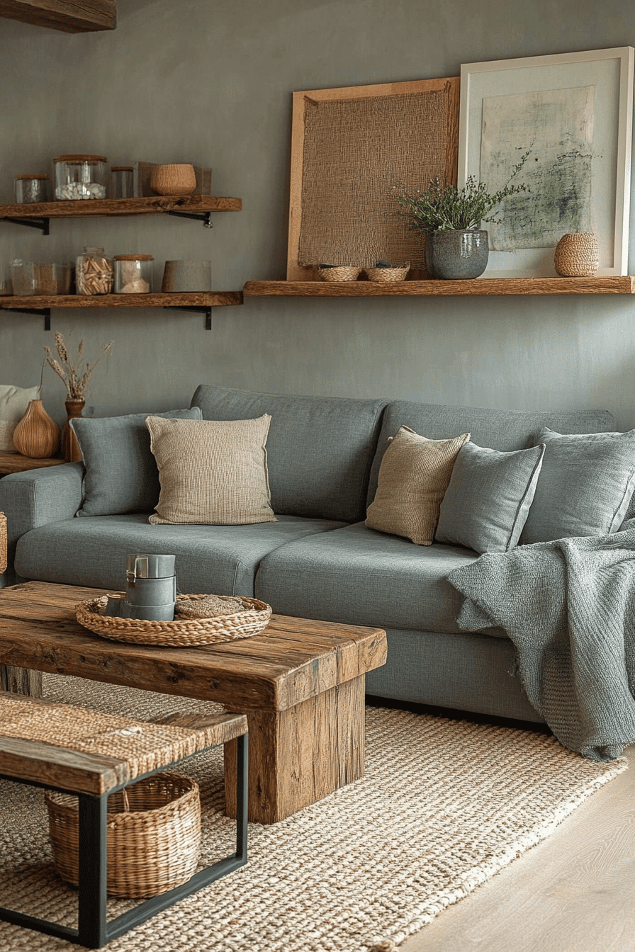 Warm up your design with a grey couch living room featuring natural wood elements. Wooden furniture softens the cool tones. Layered textiles add comfort and depth. The grey couch ties everything together. The space feels grounded and inviting. Bring warmth into your home with these grey couch living room ideas.