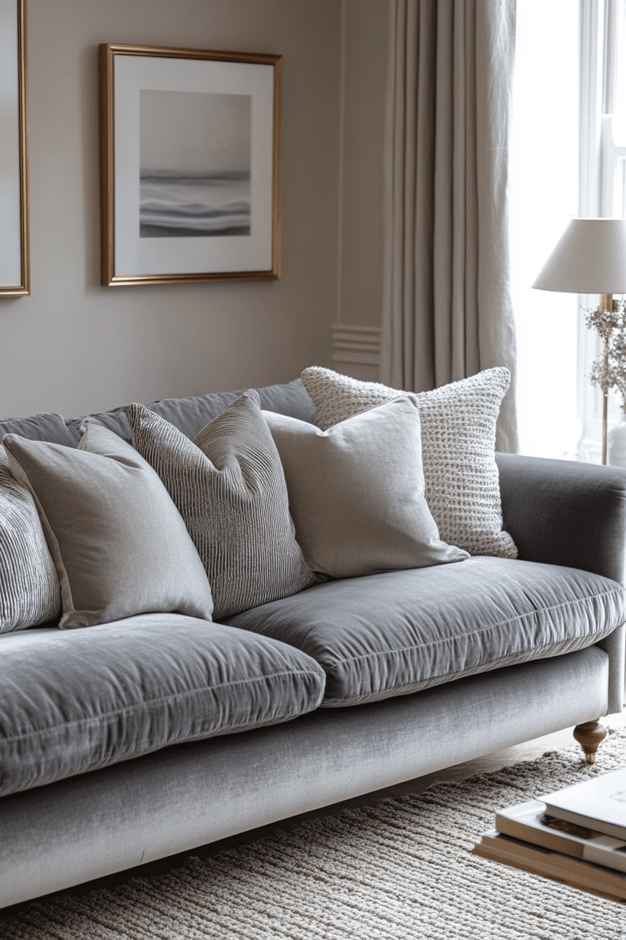 Layer in luxury with a grey couch living room that features plush textures and rich accents. Velvet pillows and deep tones add a sense of depth. The grey couch provides a sophisticated foundation. Metallic details enhance the upscale feel. The room feels cozy and refined. Elevate your comfort with these grey couch living room ideas.