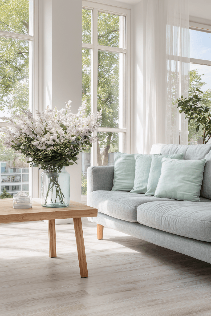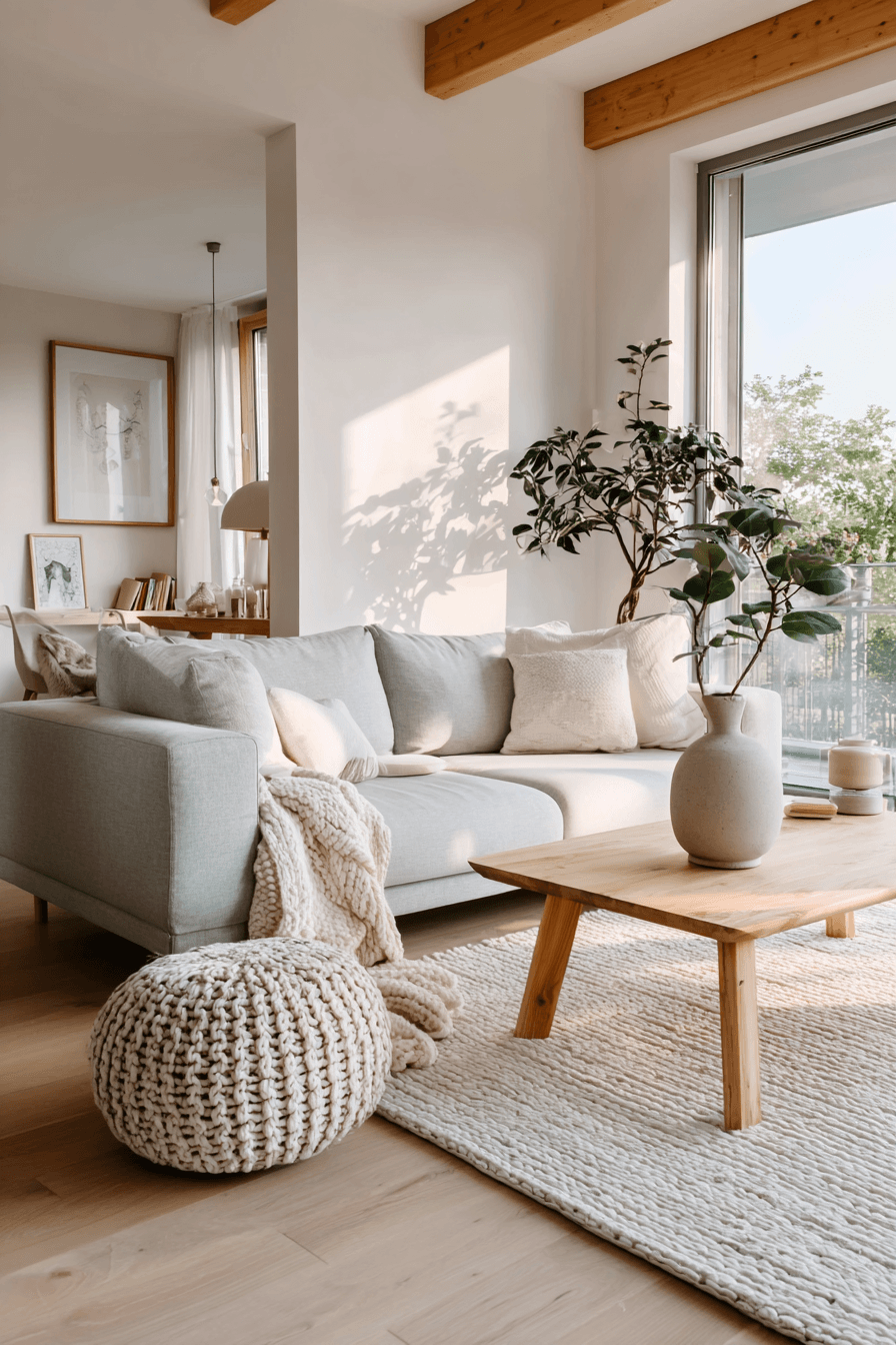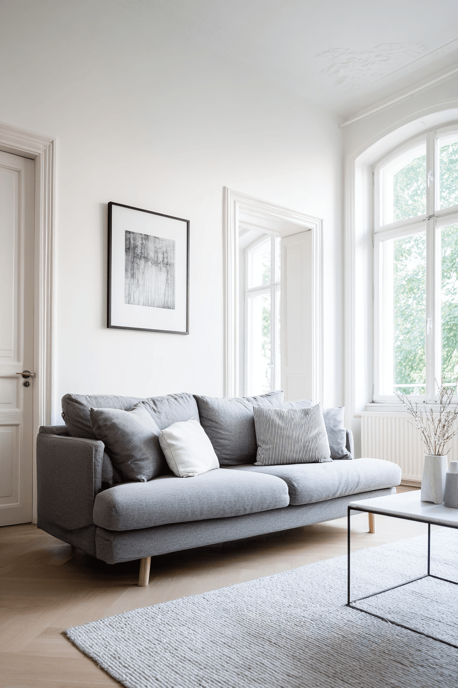 Clean Scandinavian styling transforms grey sofa living room ideas into a cozy and functional retreat. A grey sofa pairs with light wood and neutral tones to create warmth. Natural light enhances the simplicity of the space. Minimal decor keeps everything uncluttered. The result feels timeless and comfortable. Create a cozy Nordic-inspired living room today.
