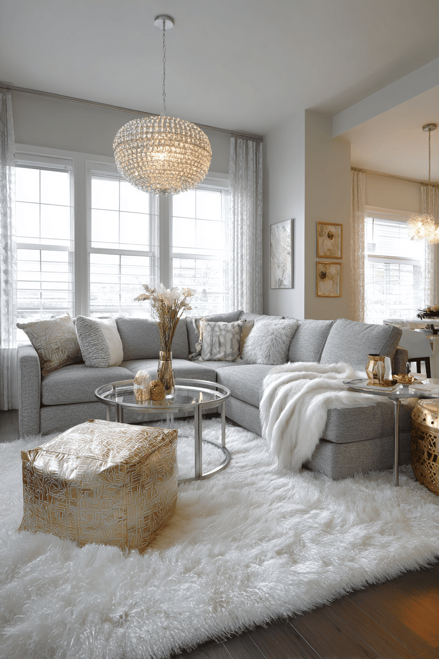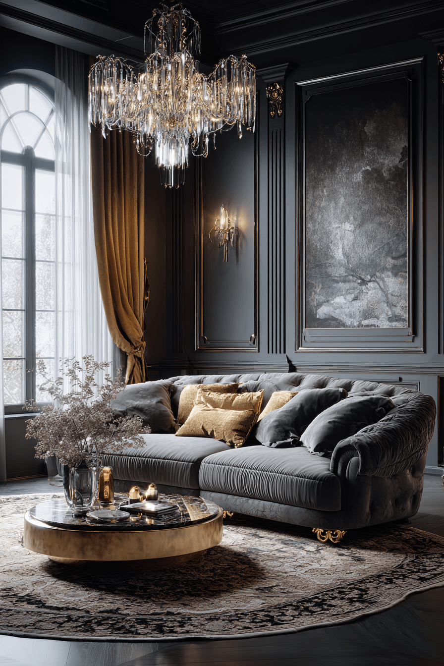 A glamorous touch elevates grey sofa living room ideas with bold textures and luxe finishes. A plush grey sofa pairs with metallic accents and statement decor. The design feels rich and layered. The space feels dramatic yet balanced. It’s ideal for a high-end aesthetic. Add a touch of glamour to your living room.