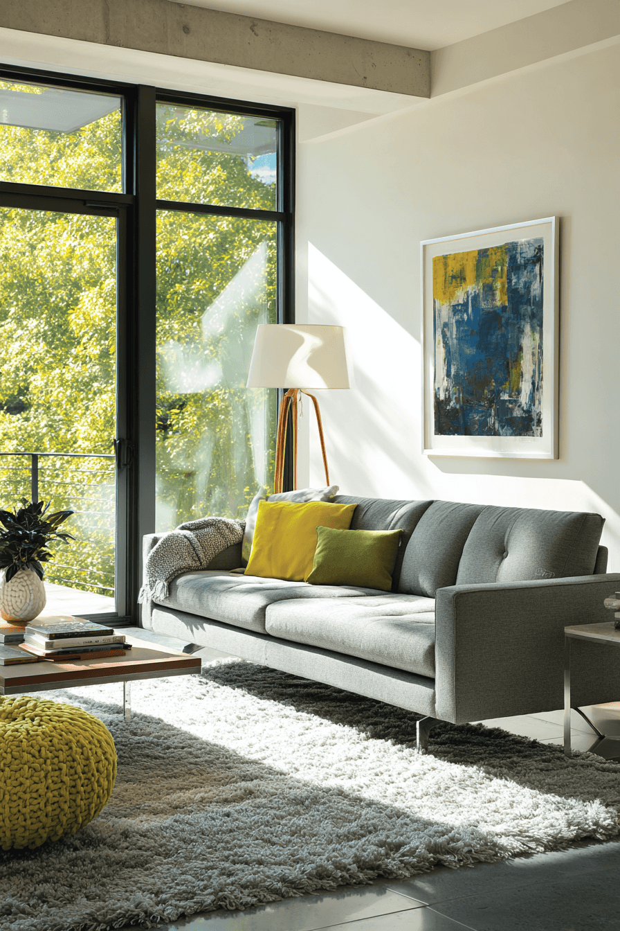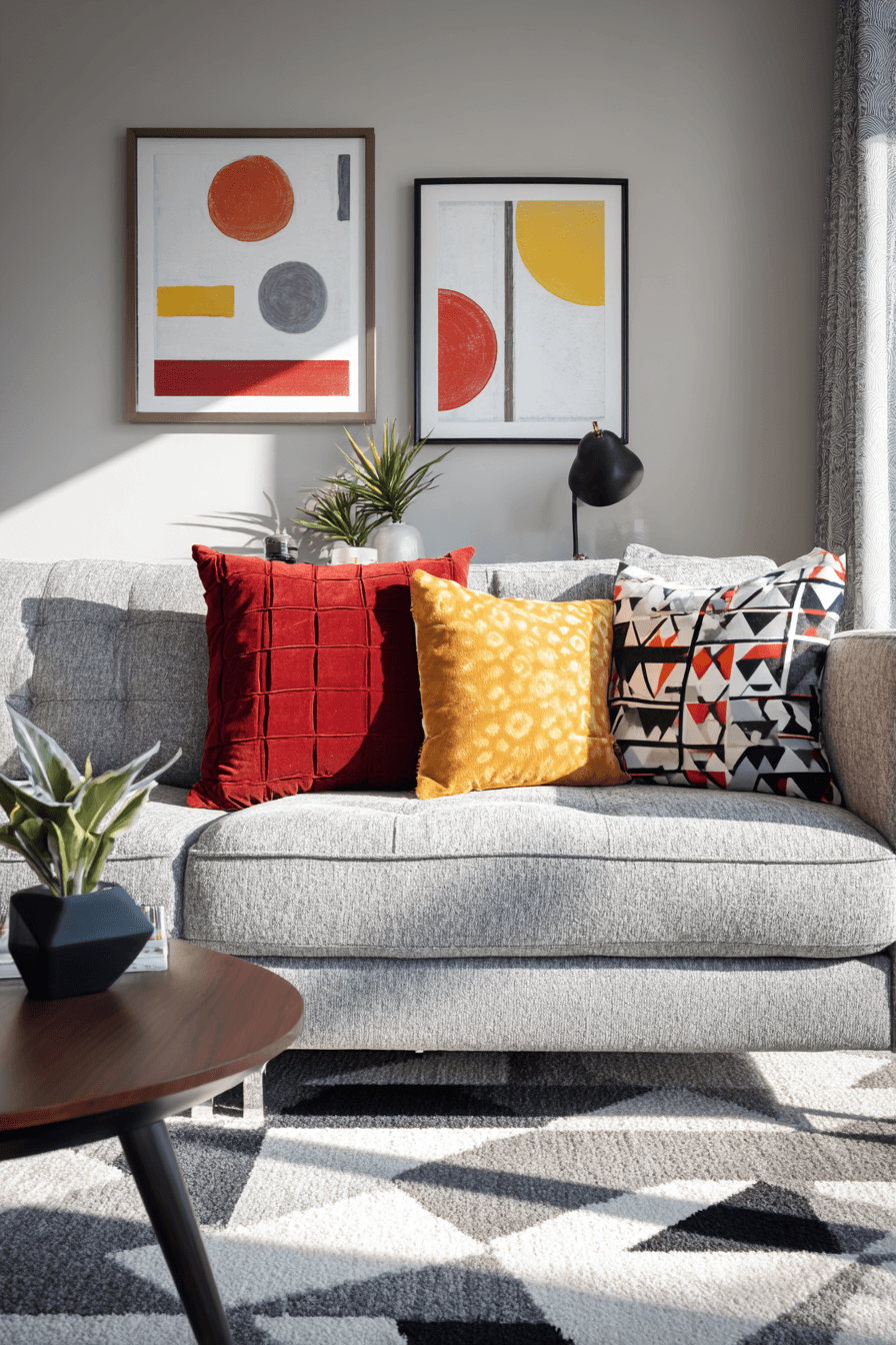 Geometric styling adds structure to grey sofa living room ideas with bold patterns and shapes. A grey sofa balances the design. The space feels modern and dynamic. Clean lines enhance the overall look. It’s great for contemporary spaces. Add bold geometry to your design.