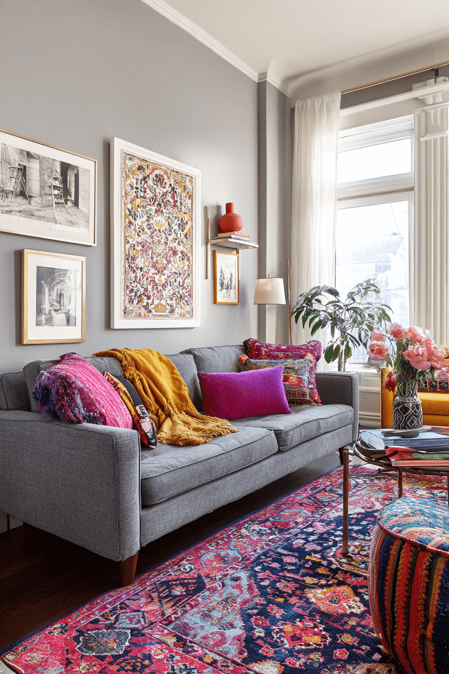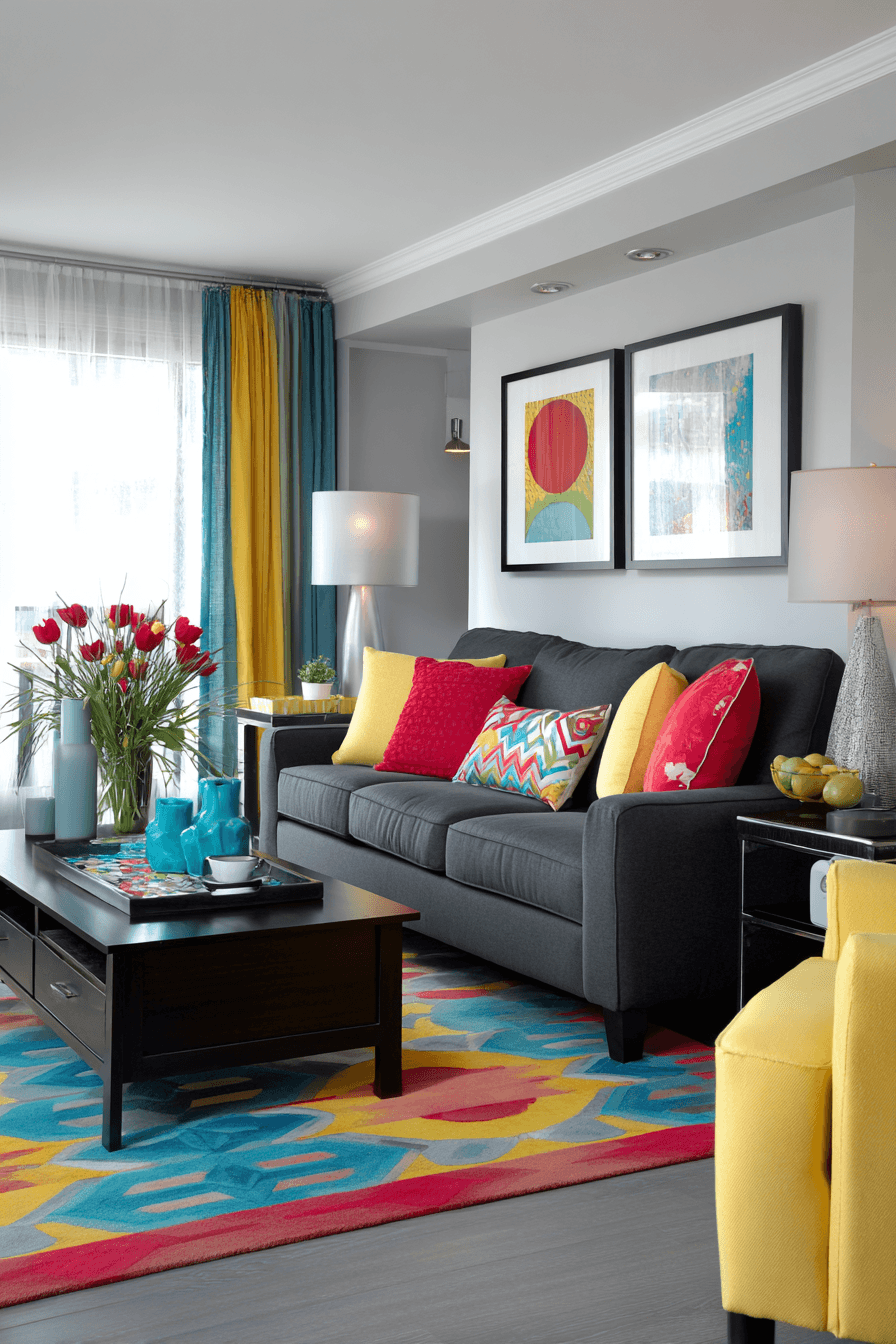 Energetic color combinations bring life into grey sofa living room ideas with a playful twist. A grey sofa allows bold decor to stand out beautifully. Mixing vibrant shades creates a dynamic yet cohesive design. The space feels lively without becoming overwhelming. It’s perfect for expressing creativity. Inject personality into your living room with this idea.