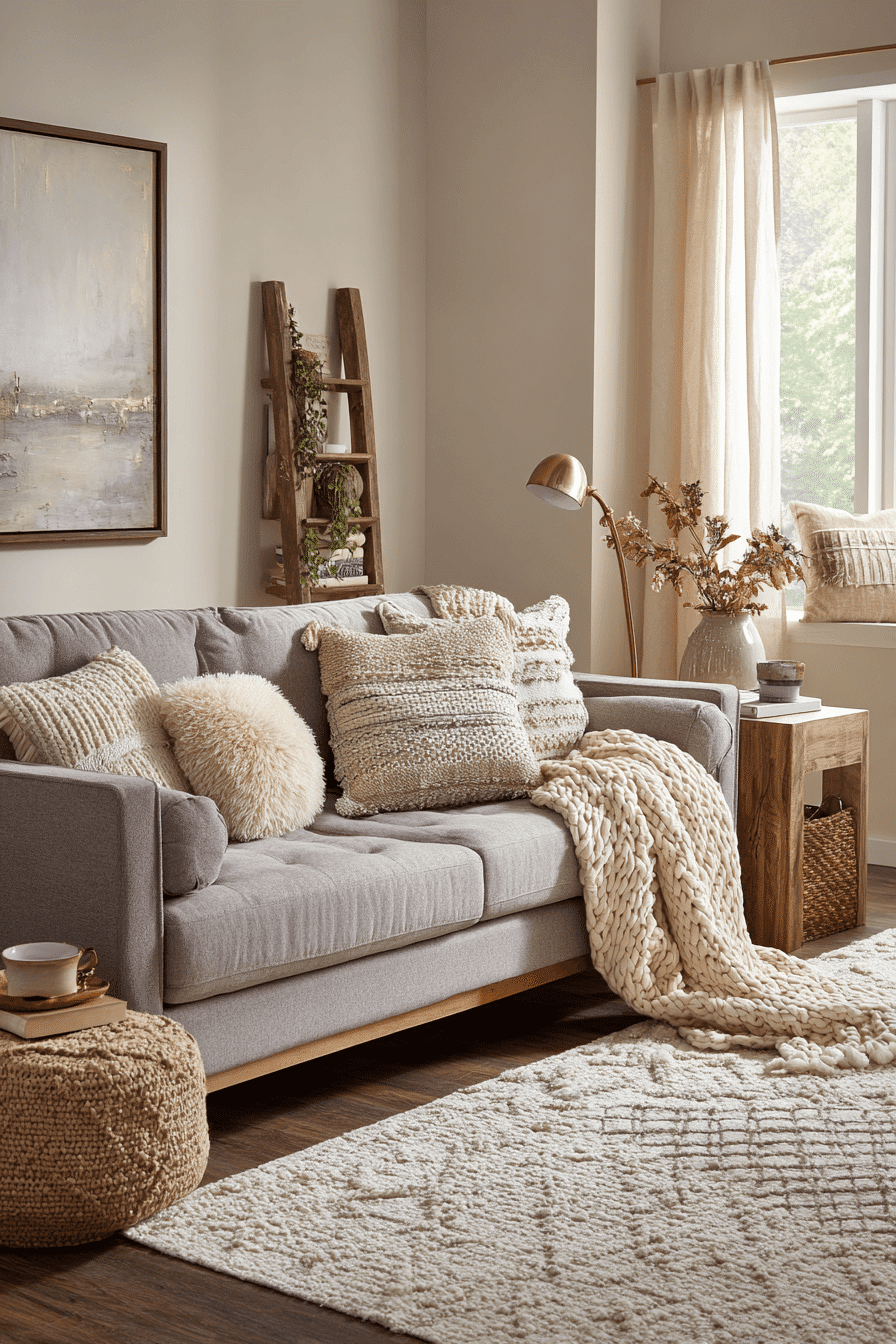Soft neutral tones warm up grey sofa living room ideas, creating a cozy and relaxing space. Beige and cream shades blend beautifully with a grey sofa. Layered textures add comfort and depth. The atmosphere feels inviting and calm. It’s perfect for everyday living. Add warmth to your living room instantly.