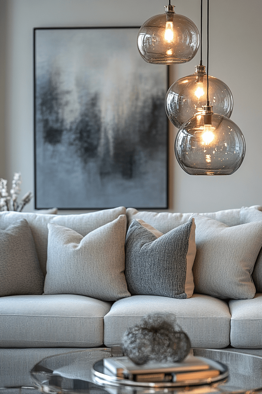 Subtle metallic elements enhance grey sofa living room ideas with a modern shine. Reflective accents add contrast without overwhelming the design. A grey sofa balances the look. The space feels sleek and refined. It’s an easy upgrade. Add a polished finish to your living room.
