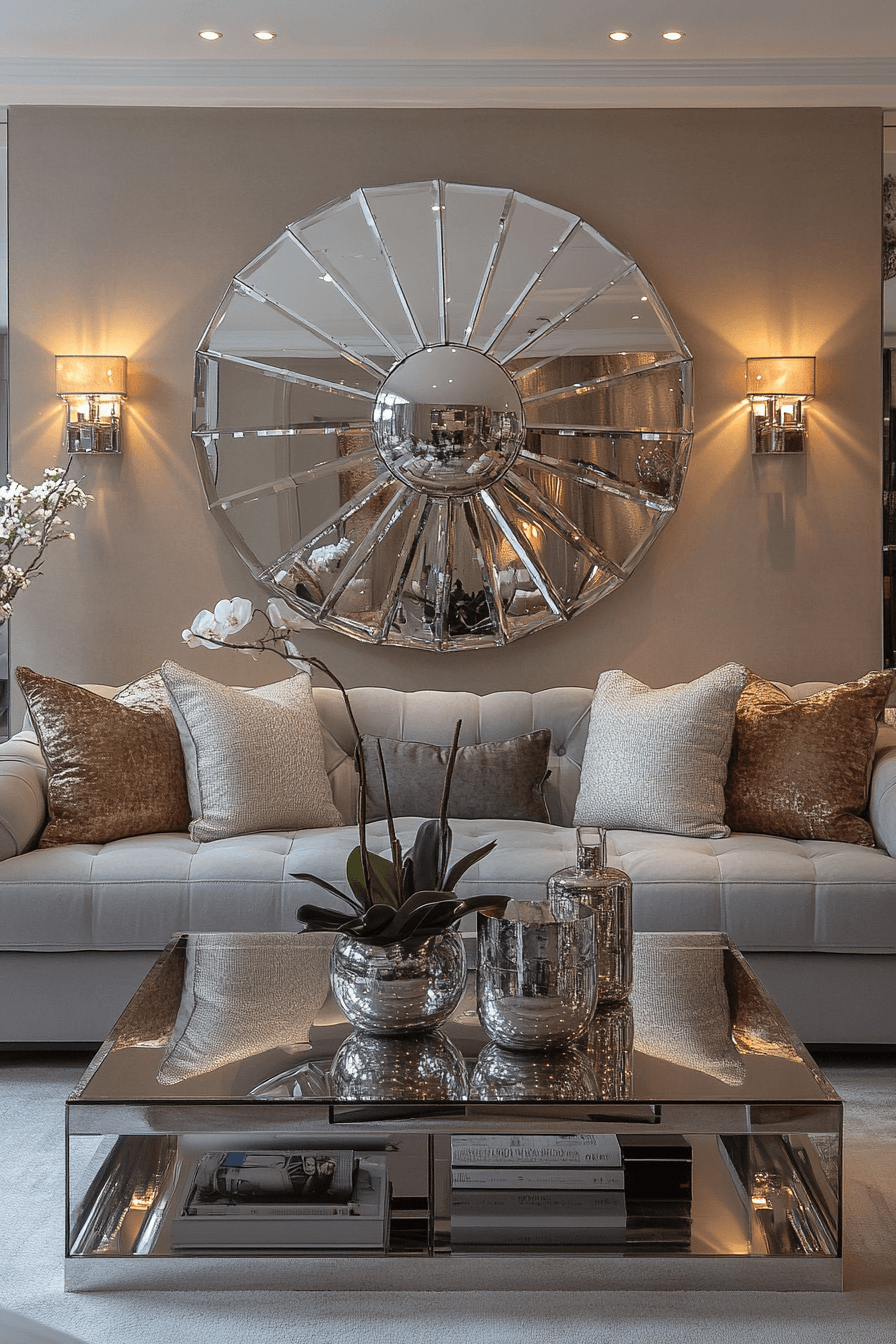 Reflective finishes expand grey sofa living room ideas by adding depth and dimension. Mirrors and glass surfaces create a more open feel. A grey sofa anchors the space. The design feels modern and airy. It’s ideal for smaller rooms. Expand your space with this simple trick.