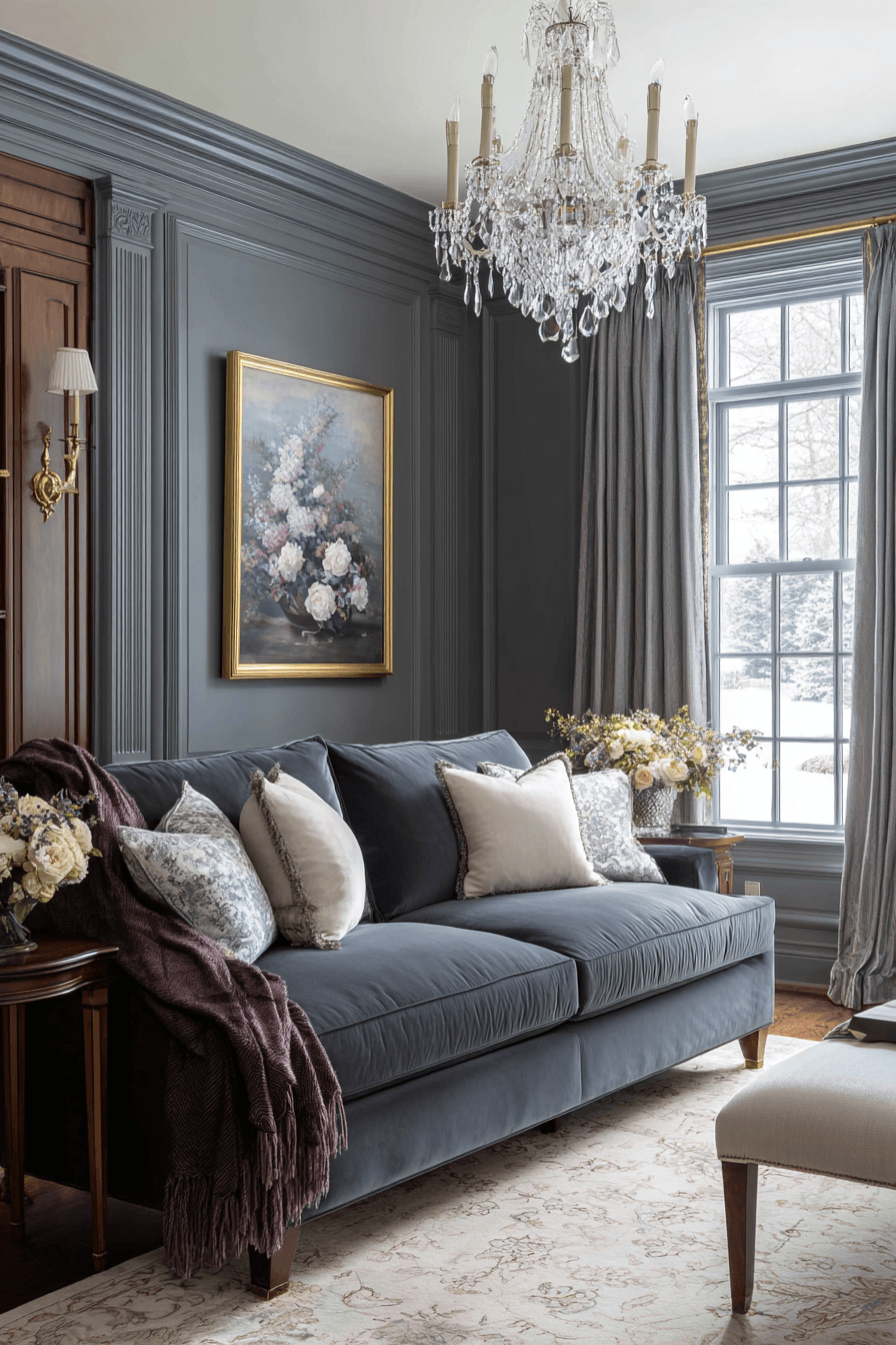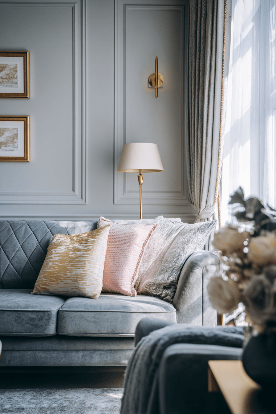 Refined glam styling adds elegance to grey sofa living room ideas without excess. Soft textures and subtle shine create balance. A grey sofa keeps everything grounded. The space feels polished yet comfortable. It’s perfect for understated luxury. Add elegance without overpowering your space.