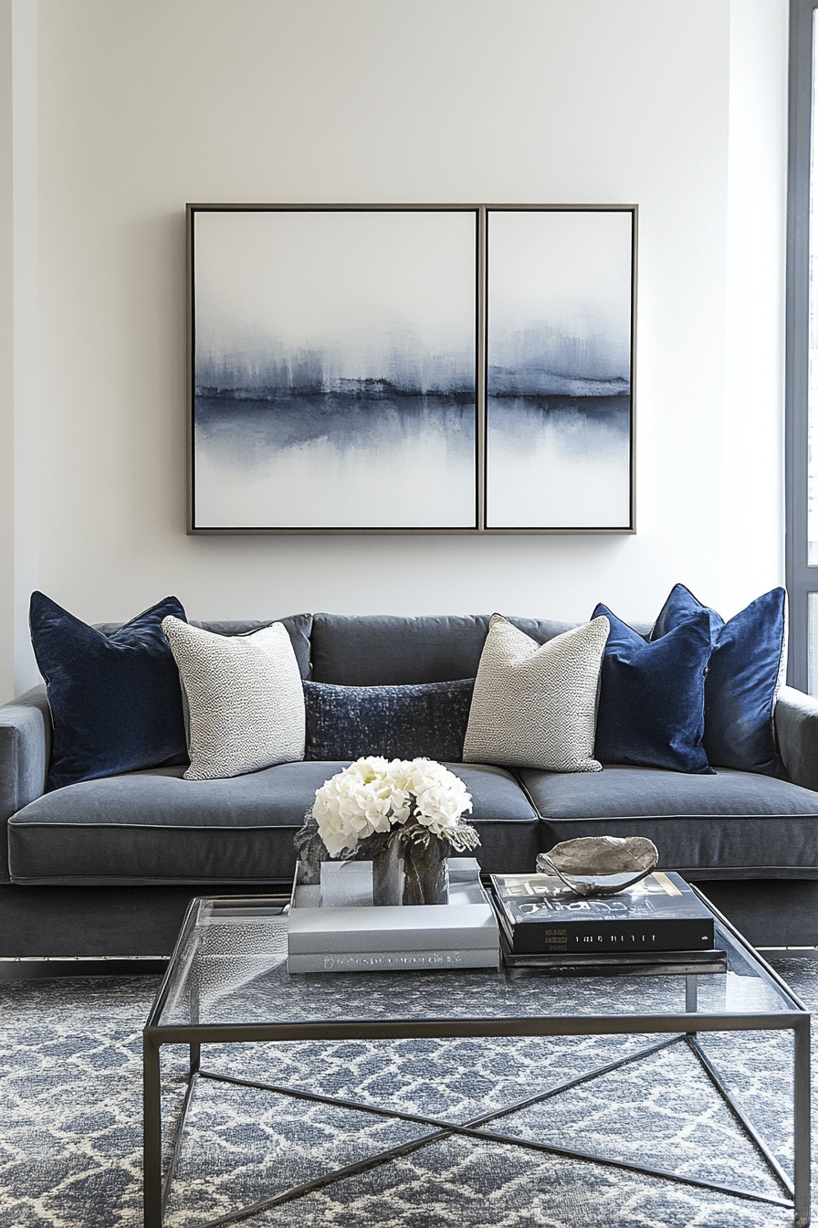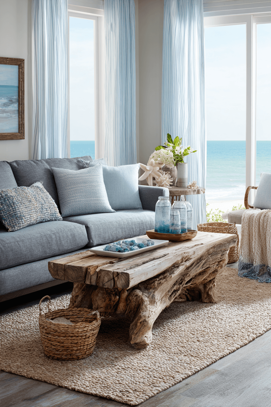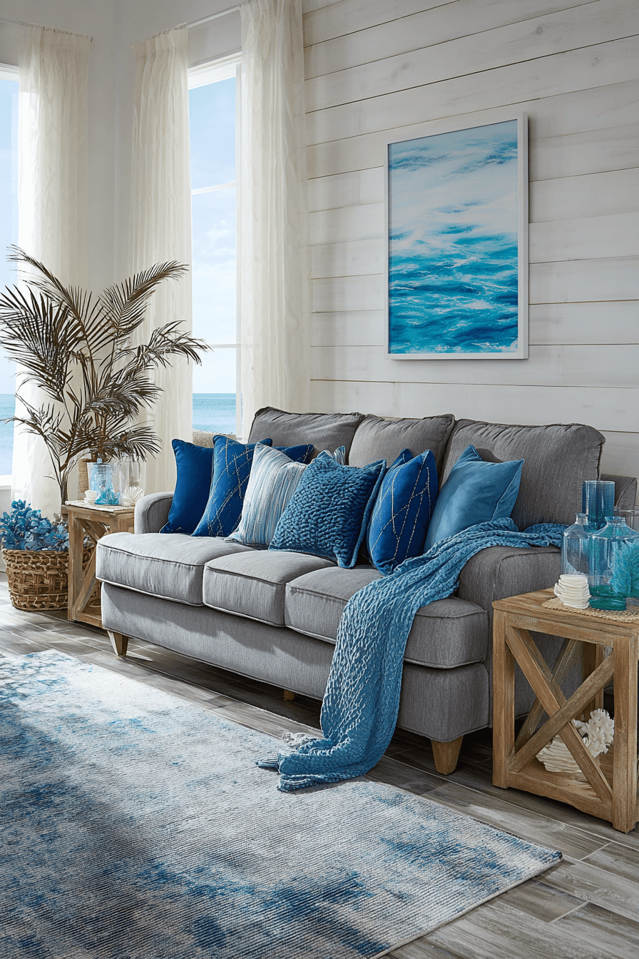 Ocean-inspired tones refresh grey sofa living room ideas with a cool and calming palette. Soft blues and natural textures create a relaxing environment. A grey sofa anchors the design. The space feels open and serene. It’s perfect for everyday comfort. Bring a calming coastal feel home.
