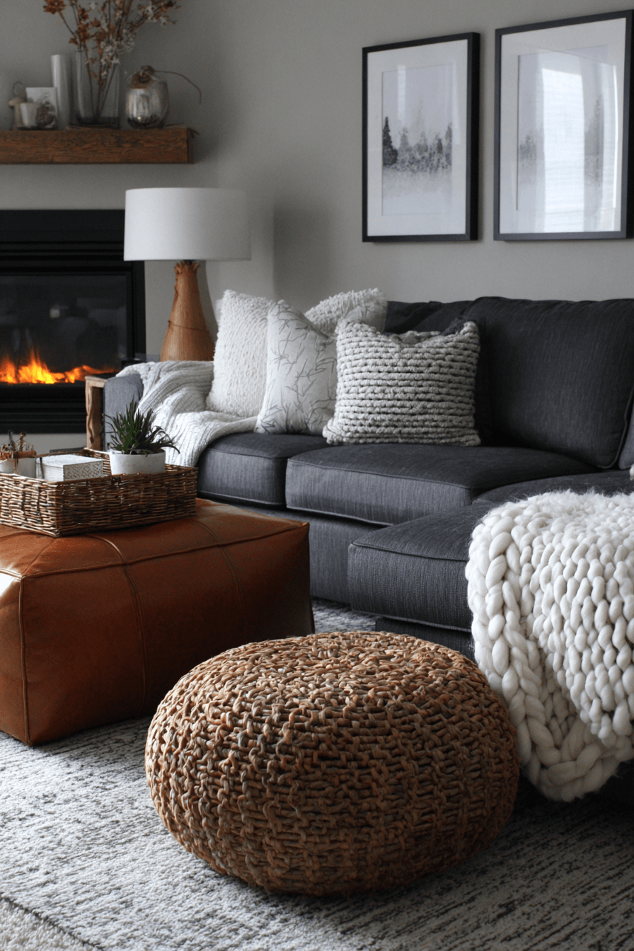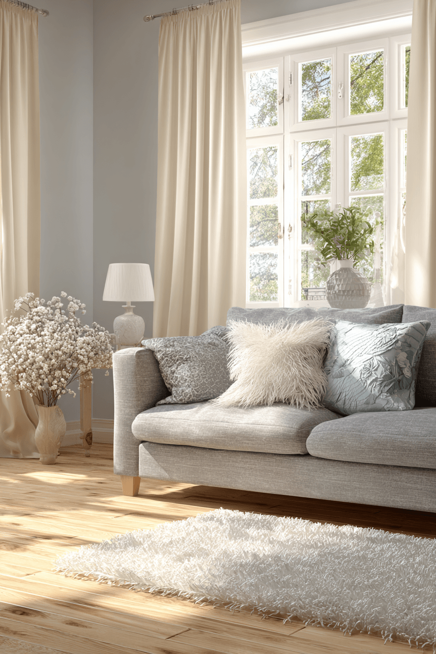 Cozy elements make grey sofa living room ideas feel warm and welcoming. Soft lighting and plush fabrics create comfort. A grey sofa becomes the focal point. The space feels inviting and relaxed. It’s ideal for everyday living. Make your living room feel extra inviting.