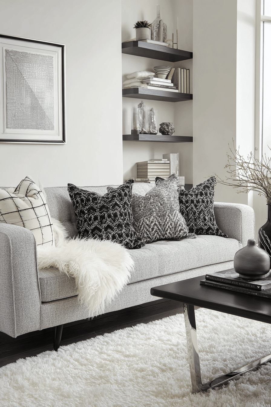A tonal color scheme elevates grey sofa living room ideas with a refined and cohesive look. Blending shades of grey, black, and white creates depth without clutter. A grey sofa fits seamlessly into this layered palette. Textures and patterns add visual interest without overwhelming the space. The result feels modern and polished. Refresh your home using this tonal styling idea.