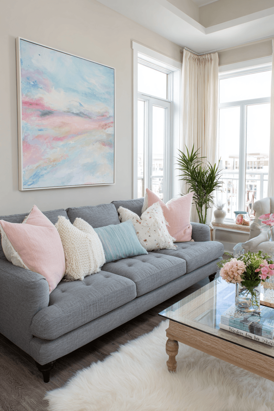 Gentle color accents soften grey sofa living room ideas, creating a light and refreshing environment. Pale hues introduce warmth while maintaining a calm aesthetic. A grey sofa acts as a neutral base that keeps everything balanced. The space feels airy and welcoming. It’s perfect for adding subtle personality. Add a soft glow to your space with these color touches.