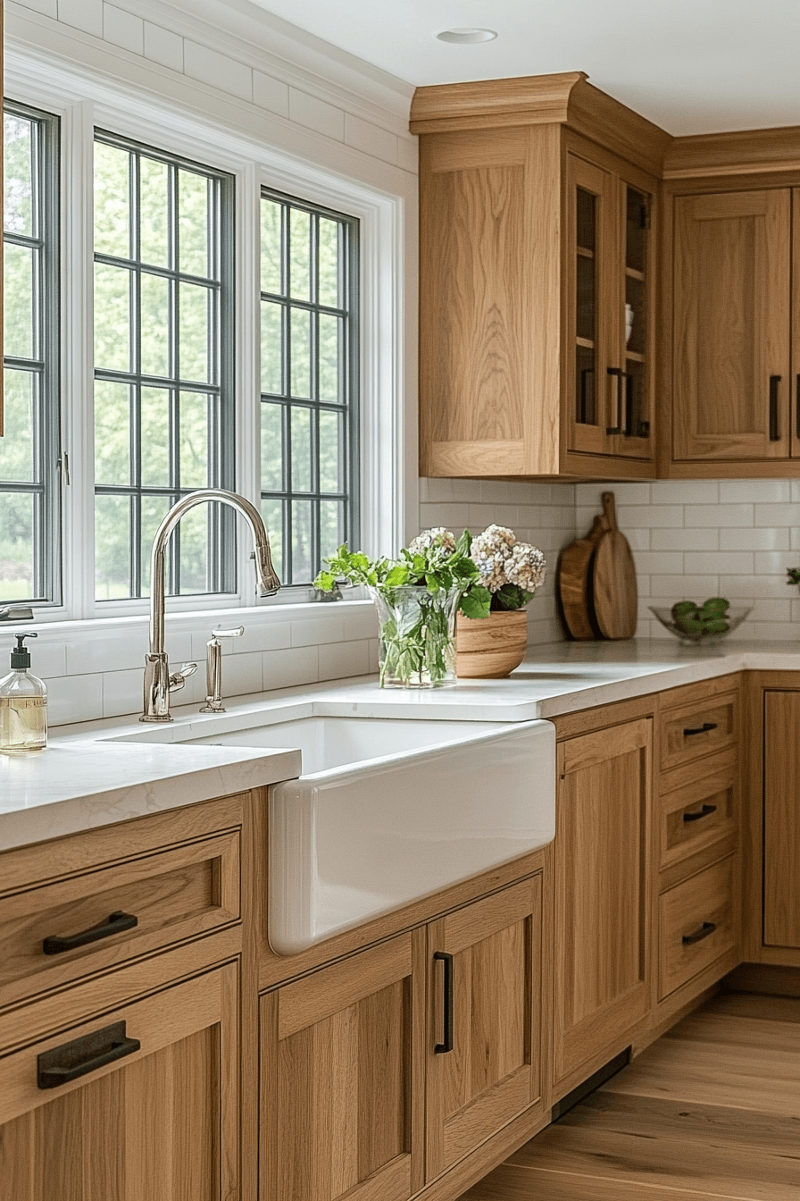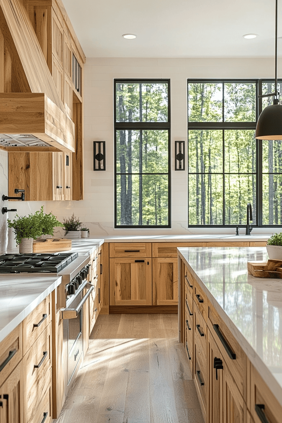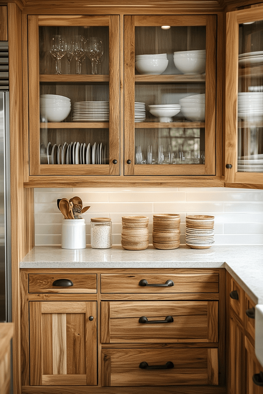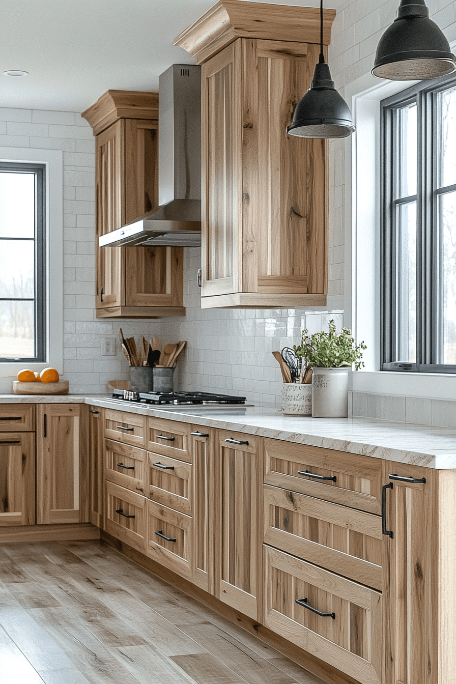 Polished surfaces paired with hickory kitchen cabinets create a refined yet natural look. Smooth materials balance the textured grain. Hickory kitchen cabinets stand out beautifully in this combination. The space feels clean and elevated. This pairing works across many styles. Combine textures for a refined kitchen look.