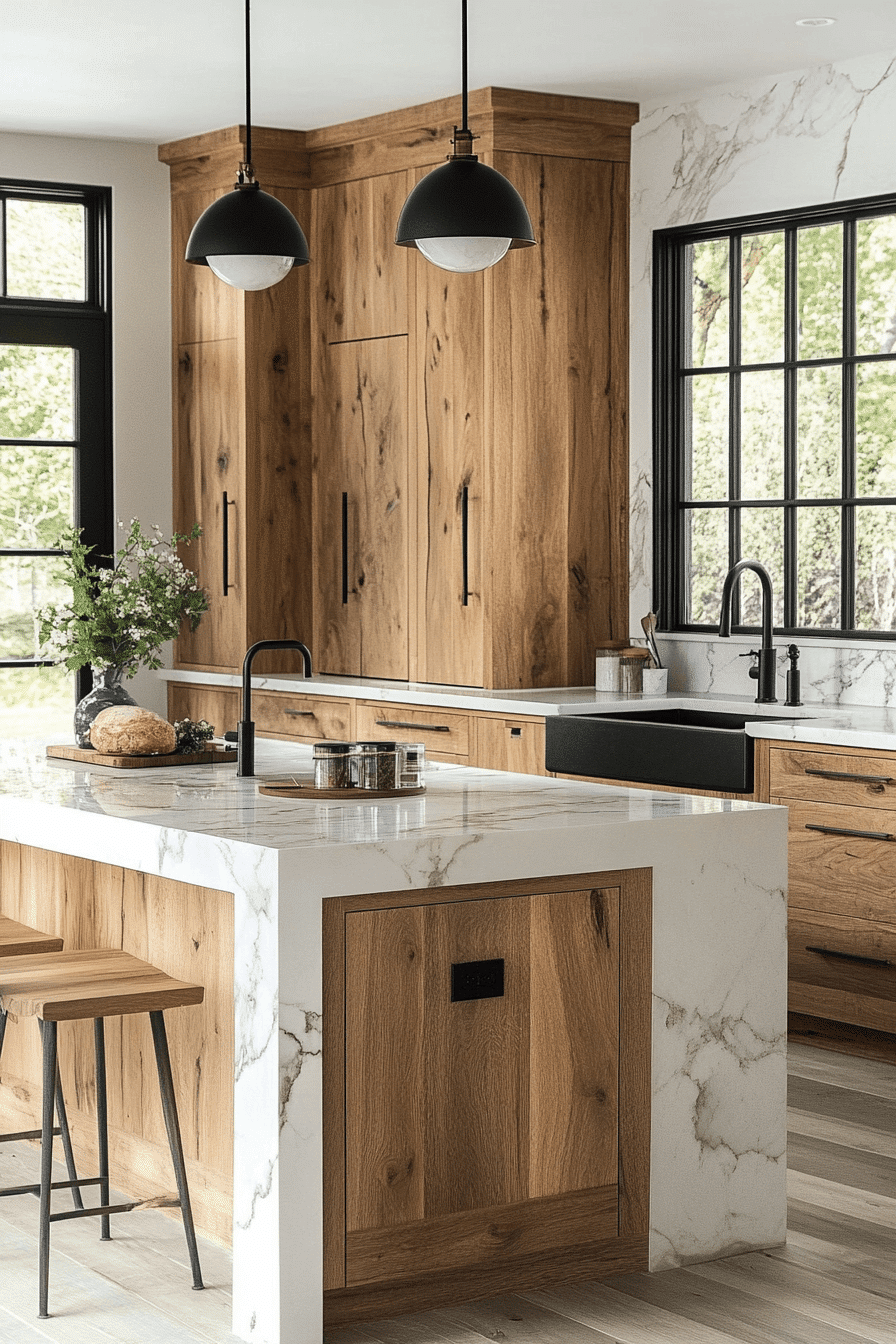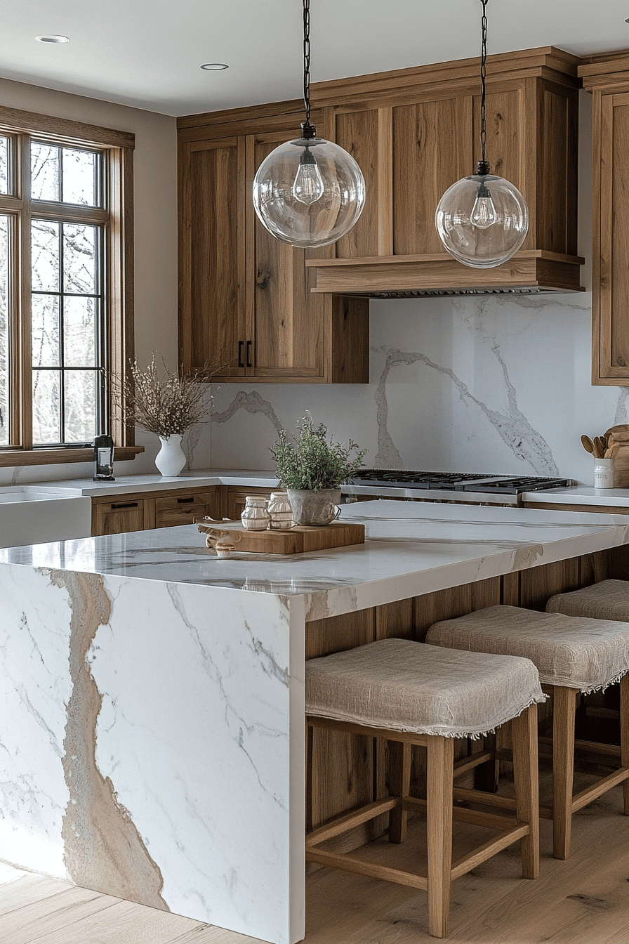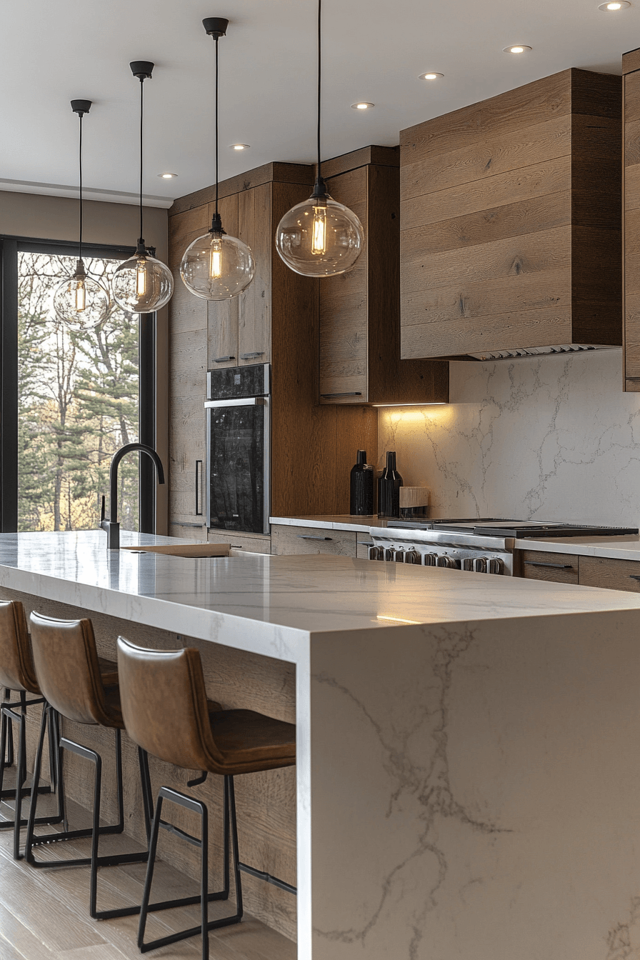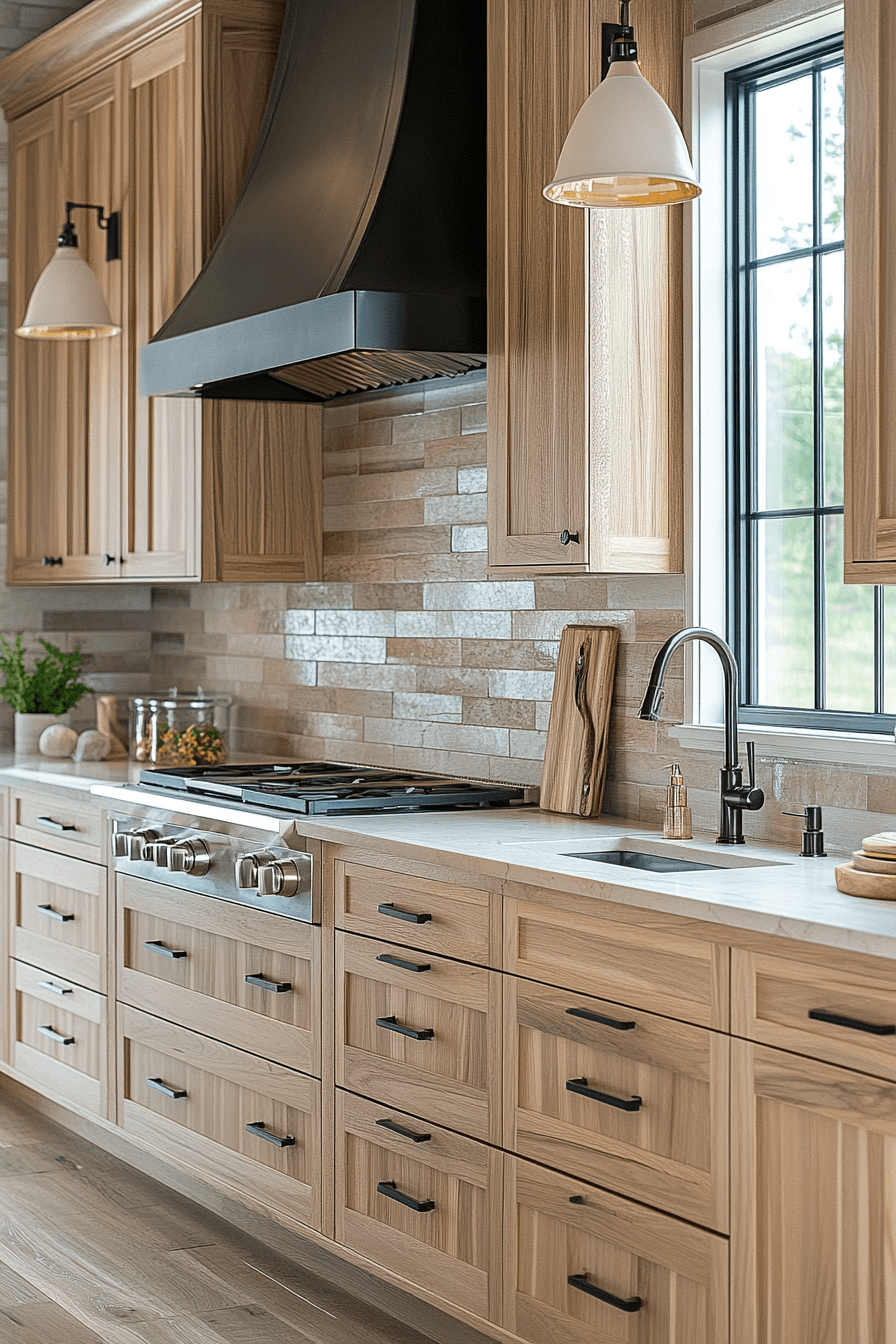 Polished surfaces paired with hickory kitchen cabinets create a refined yet natural look. Smooth materials balance the textured grain. Hickory kitchen cabinets stand out beautifully in this combination. The space feels clean and elevated. This pairing works across many styles. Combine textures for a refined kitchen look.