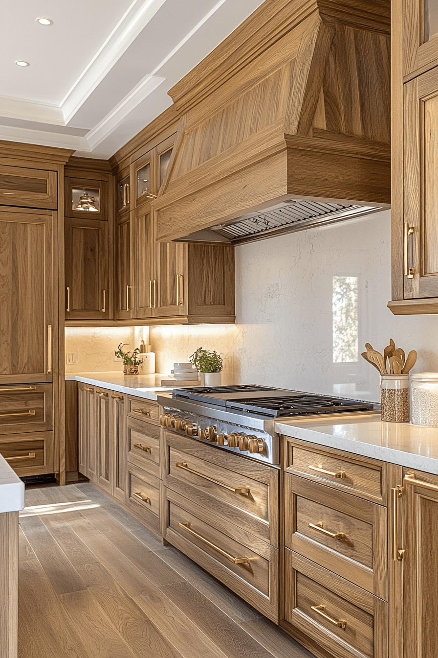 Brushed gold accents enhance hickory kitchen cabinets with warmth and subtle shine. The metallic tones highlight the wood beautifully. Hickory kitchen cabinets feel more elevated with this addition. The space feels refined yet inviting. It works across many styles. Add a touch of elegance with gold accents.