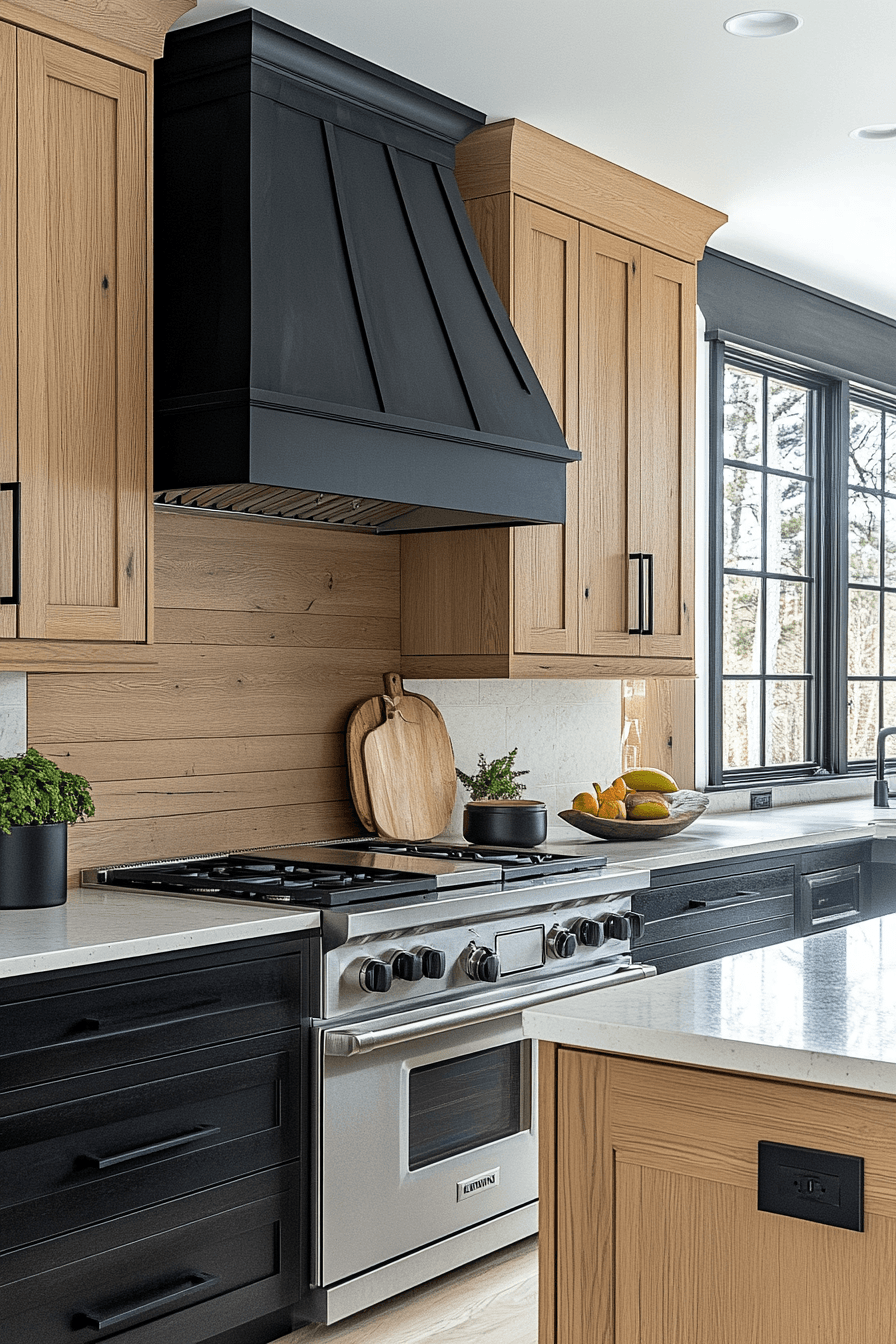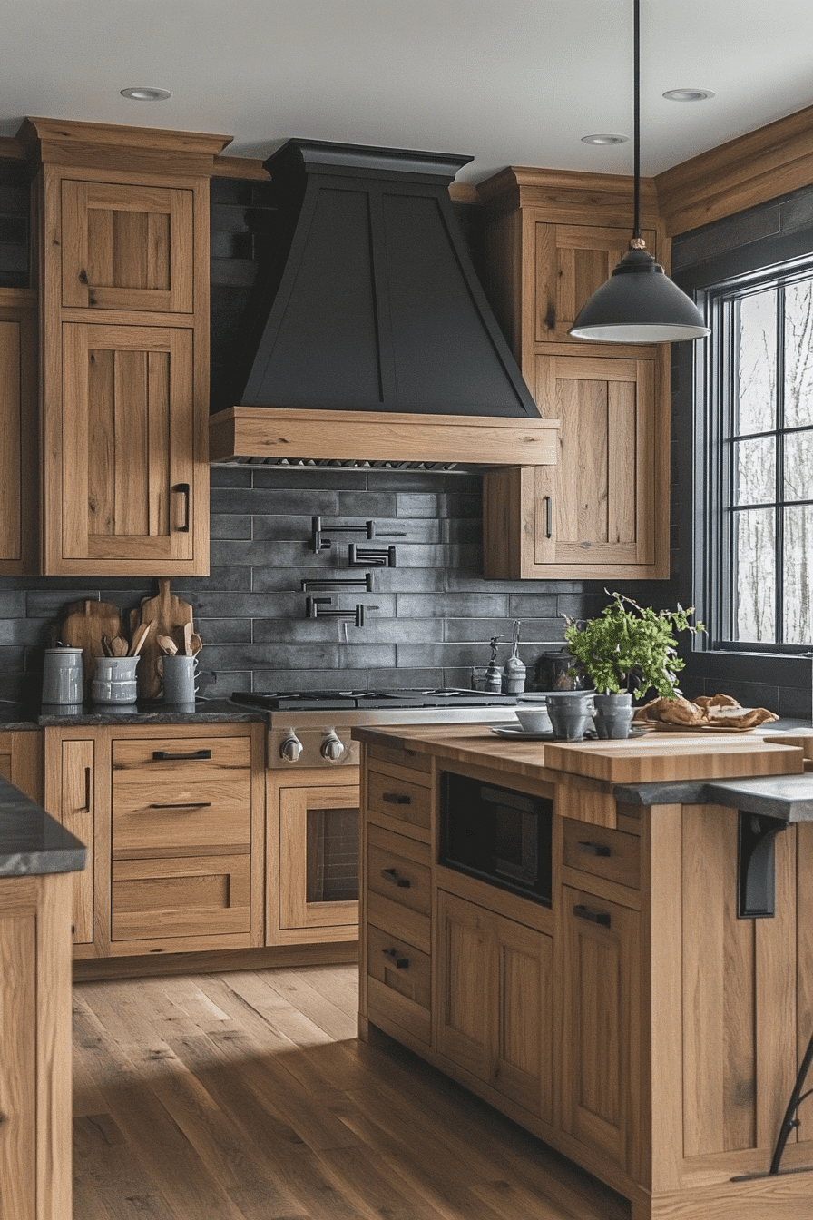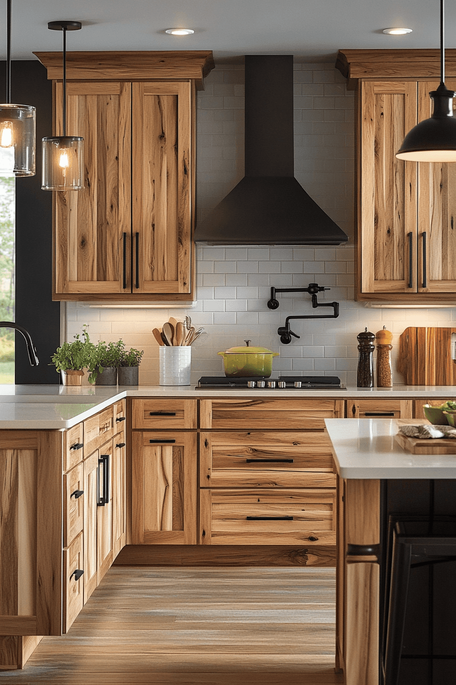 Sharp contrast styling elevates hickory kitchen cabinets with bold, dark details. Black fixtures and accents enhance the natural warmth of the wood. Hickory kitchen cabinets remain the star while the contrast adds definition. The design feels modern and intentional. The space feels striking and balanced. Introduce bold contrast into your kitchen.
