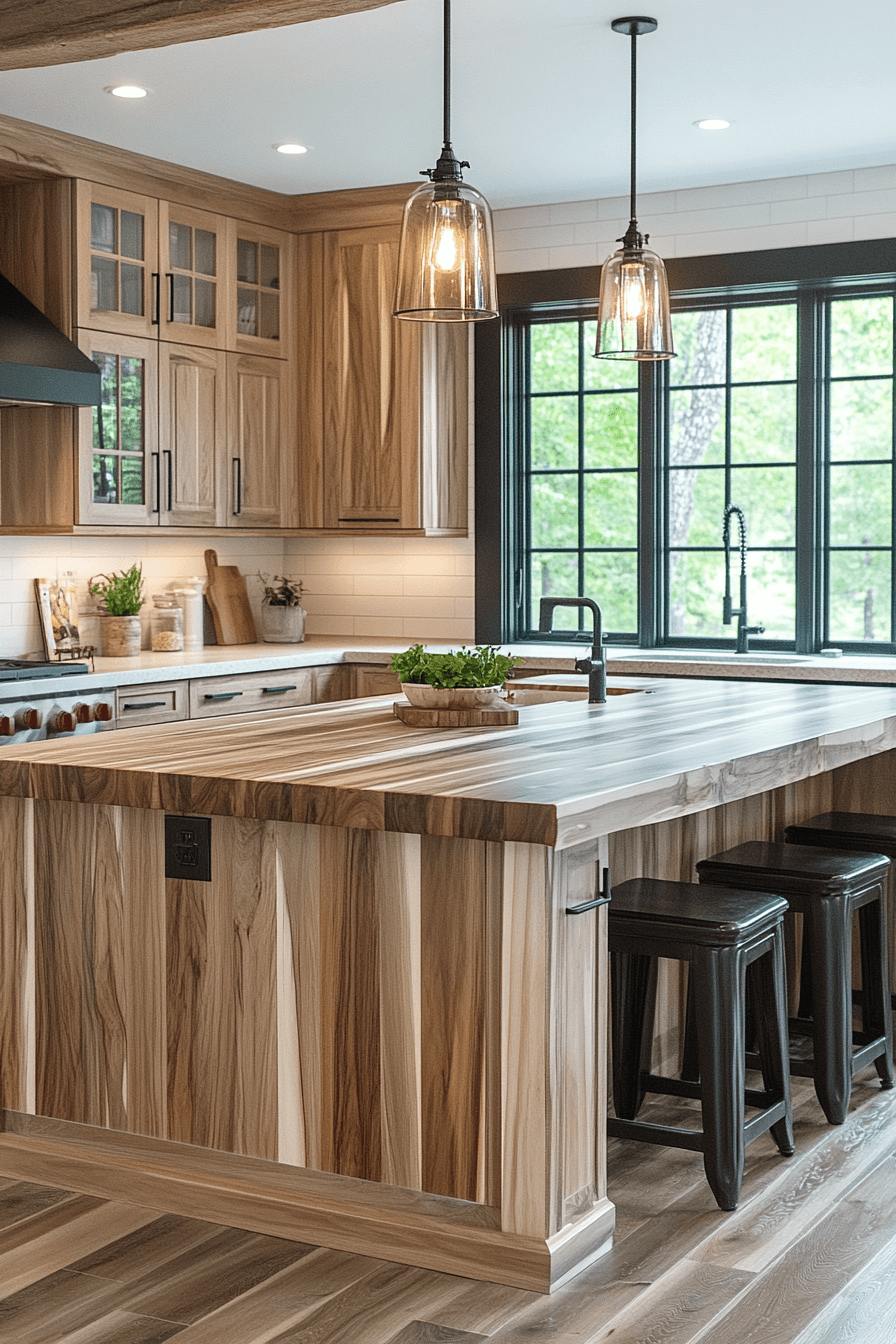 Blending different wood tones alongside hickory kitchen cabinets creates depth and interest. Mixing finishes adds a designer touch. Hickory kitchen cabinets act as the anchor. The space feels layered and dynamic. The design feels rich and balanced. Add dimension through mixed wood styling.