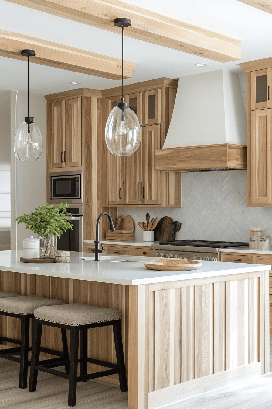 Simple panel styles highlight the natural beauty of hickory kitchen cabinets while keeping the design clean. The structure allows the grain to shine. Hickory kitchen cabinets feel versatile and timeless in this style. The space feels balanced and uncluttered. It adapts easily to different aesthetics. Highlight natural wood with this simple design.
