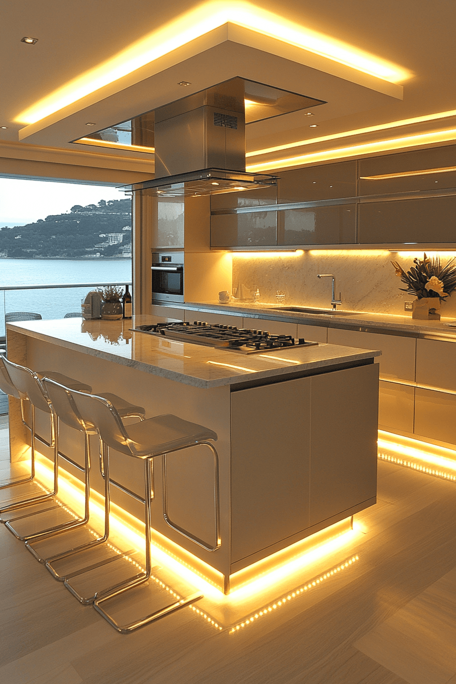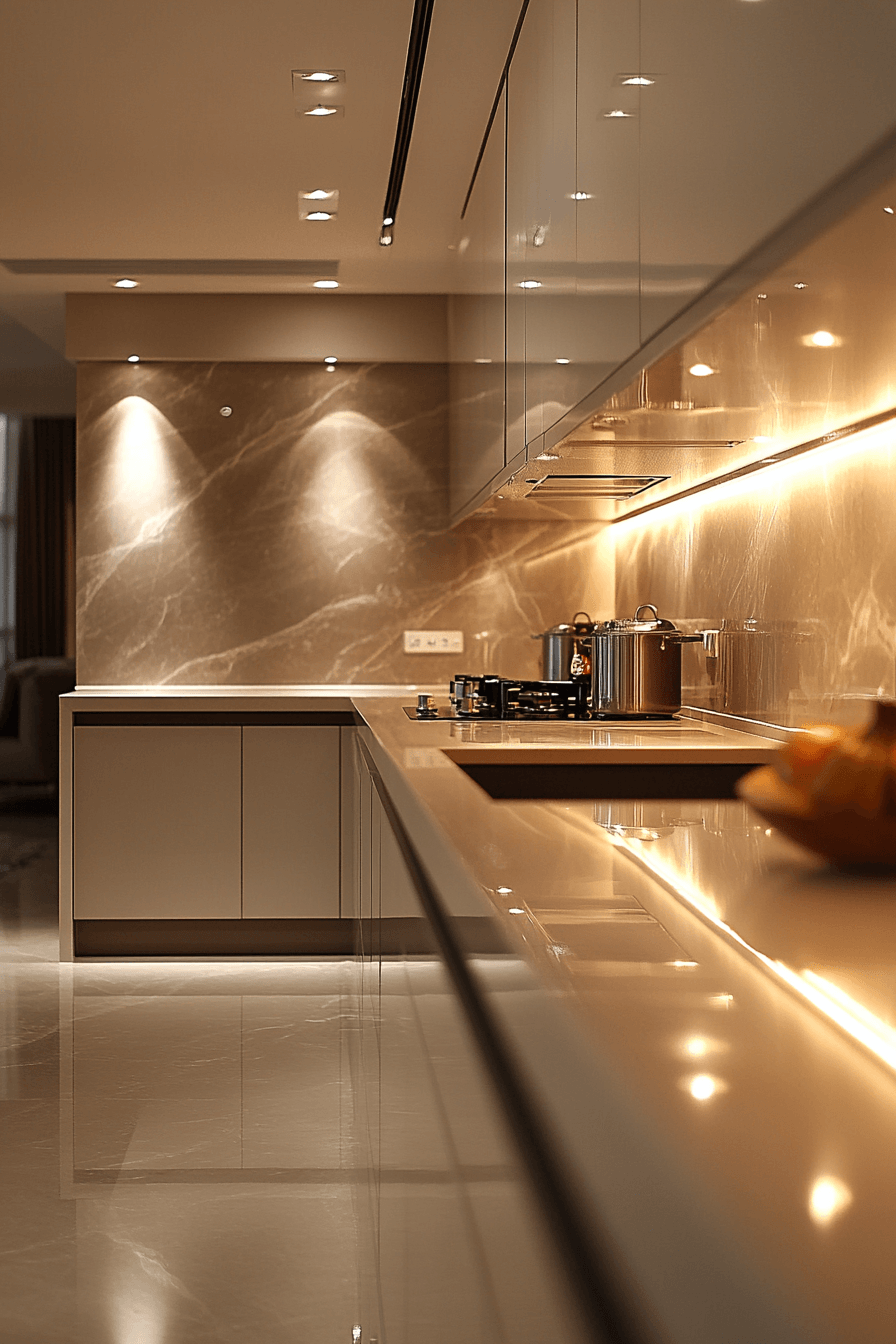 Integrated LED designs create seamless illumination without visible fixtures. Built-in systems keep the look minimal and modern. Kitchen lighting ideas like this enhance clean lines and open layouts. Light spreads evenly across surfaces. The space feels streamlined and contemporary. Upgrade to seamless lighting design.