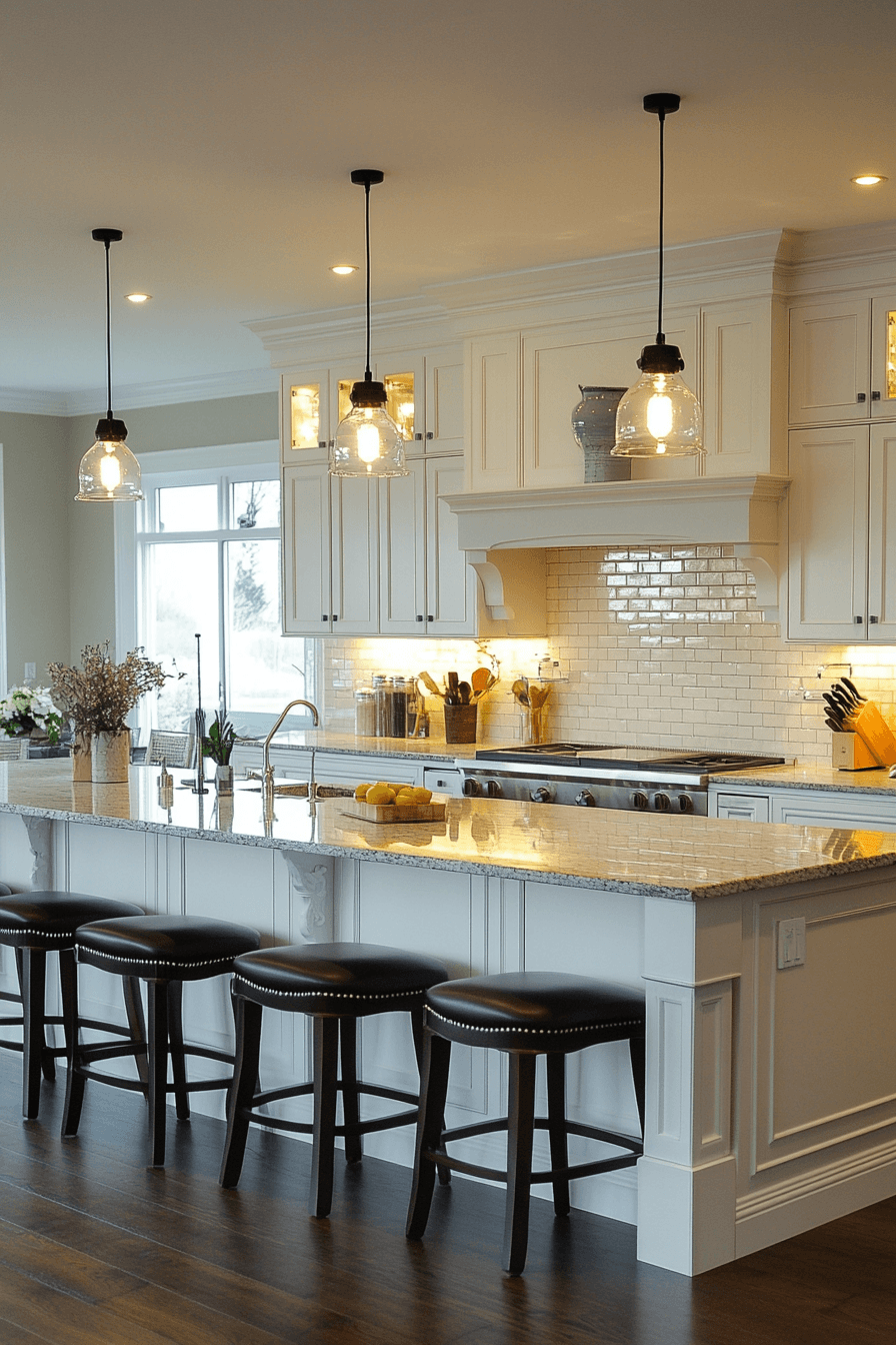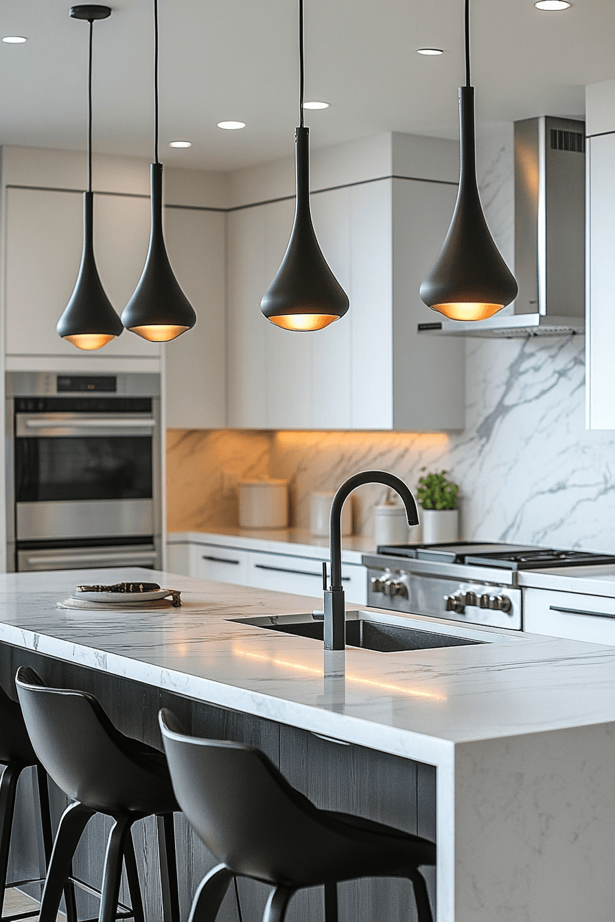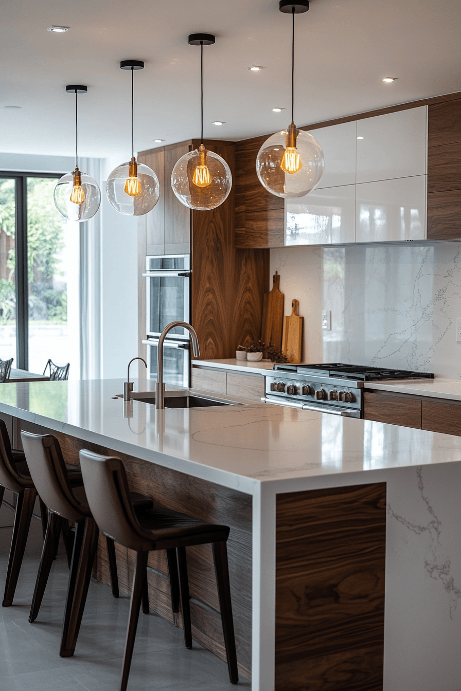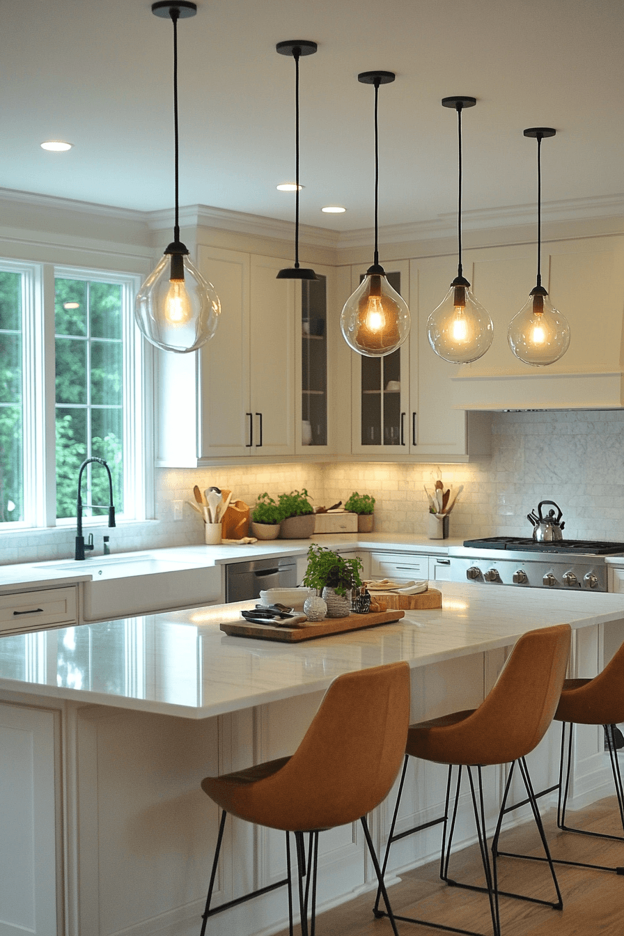 Glass statement fixtures amplify light while creating visual impact. Reflective surfaces enhance brightness across the room. Kitchen lighting ideas like this draw attention naturally. Positioned strategically, they elevate the overall design. The space feels polished and dynamic. Make your lighting the centerpiece.