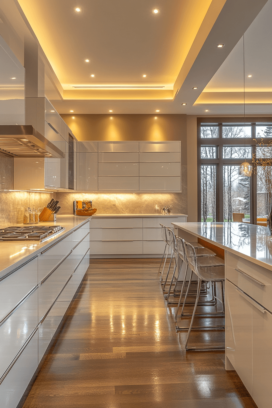 Circular halo fixtures create a smooth, even glow that feels clean and modern. Light spreads gently without overwhelming brightness. Kitchen lighting ideas like this complement minimalist designs. The look stays subtle yet impactful. The space feels calm and refined. Introduce a modern halo feature.