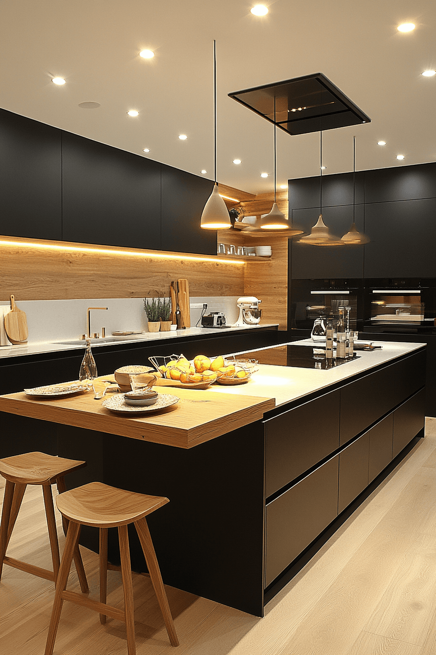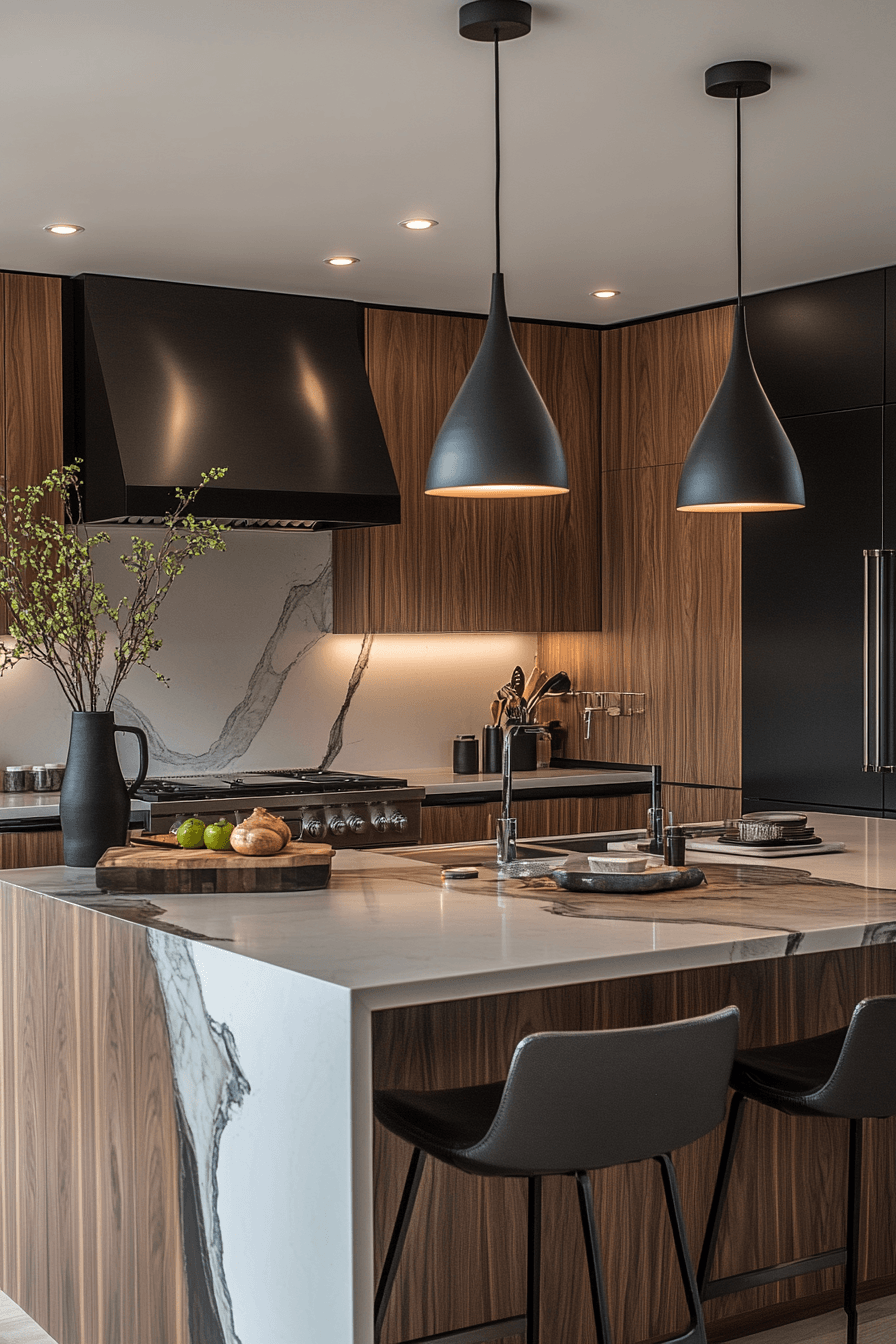 Dark accent fixtures create striking contrast that enhances visual depth in your kitchen. Bold finishes stand out against lighter surfaces. Kitchen lighting ideas like this add definition and style. Coordinated hardware ties the look together. The space feels grounded and modern. Introduce contrast that elevates your design.