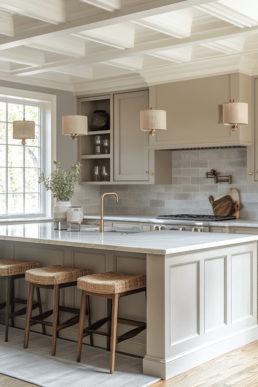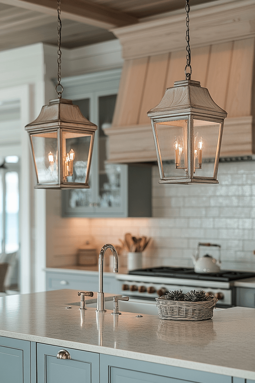 Coastal lantern fixtures create a breezy and relaxed atmosphere using light materials. Soft illumination enhances the open feel of the space. Kitchen lighting ideas like this pair well with neutral palettes. The mood feels fresh and airy. The design feels easygoing and bright. Bring coastal inspiration into your kitchen.