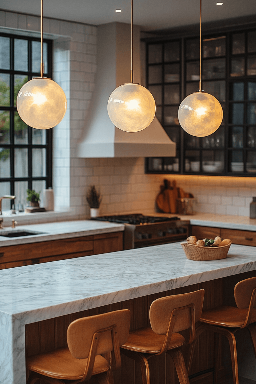 Rounded globe lights soften the look of your kitchen while adding personality. Even illumination creates a welcoming atmosphere. Kitchen lighting ideas like this feel timeless yet playful. Grouping fixtures enhances visual interest. The space feels unique and balanced. Add playful lighting into your design.
