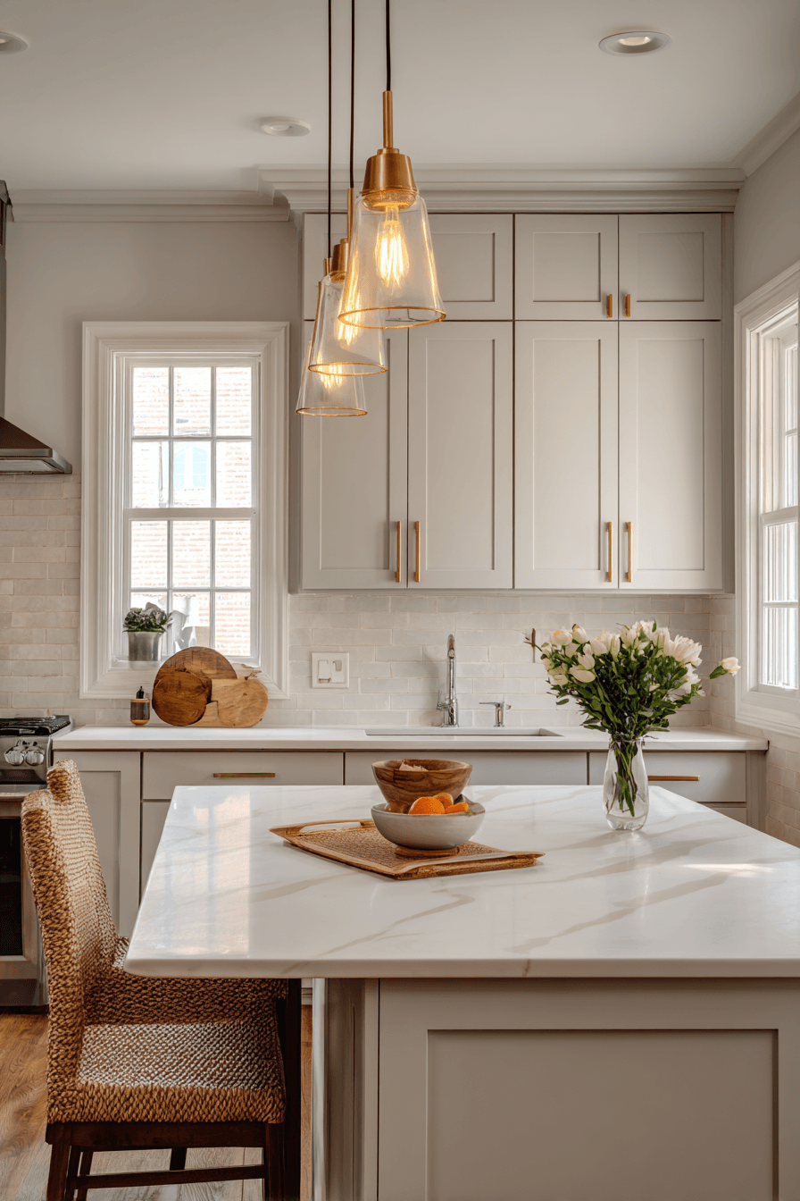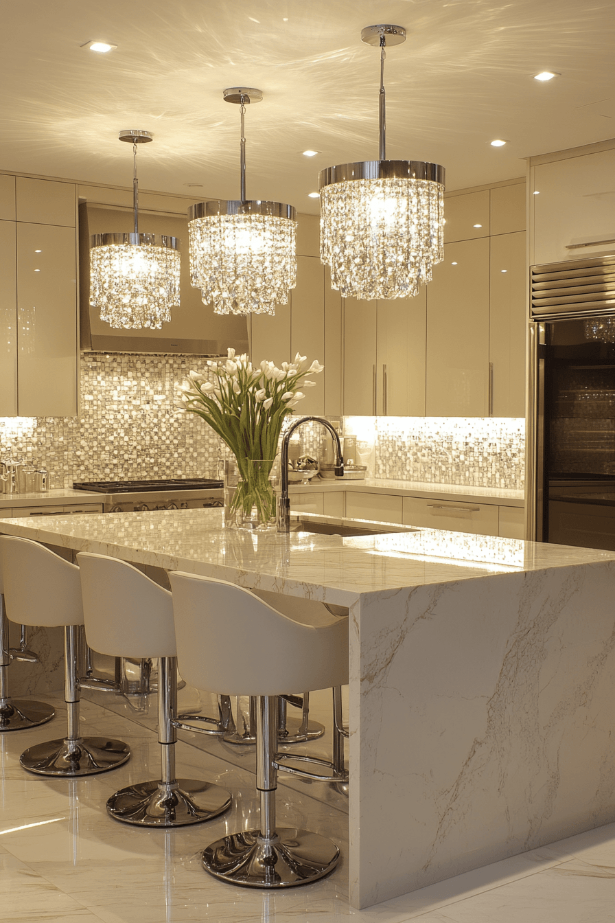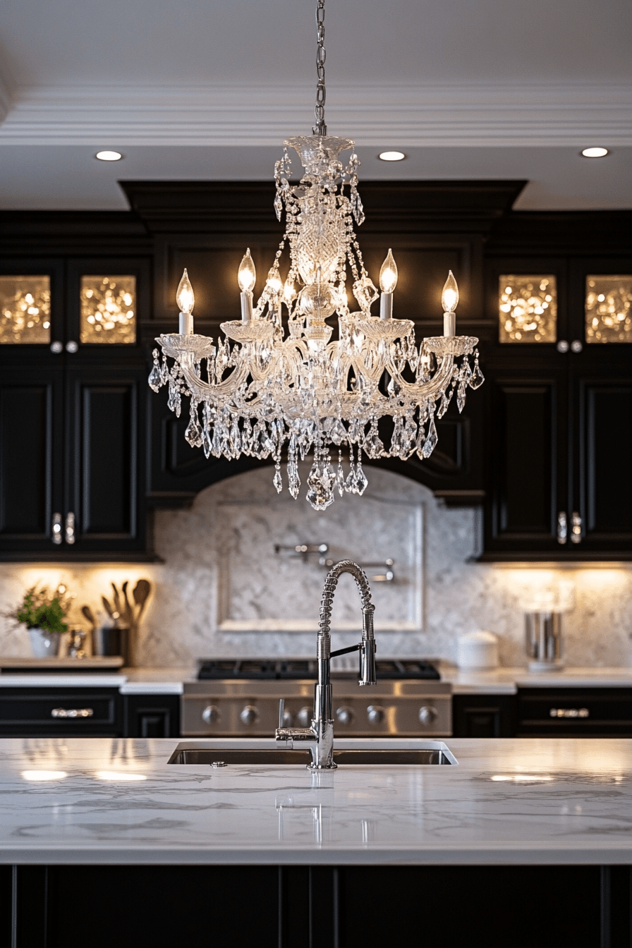 Crystal pendants enhance brightness while adding a refined sparkle across the space. Light reflects beautifully through faceted surfaces. Kitchen lighting ideas like this bring elegance into everyday spaces. Positioned strategically, they draw natural attention. The overall look feels polished. Add sparkle to your lighting setup.