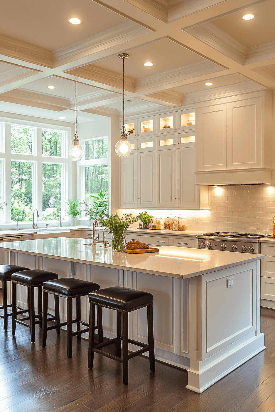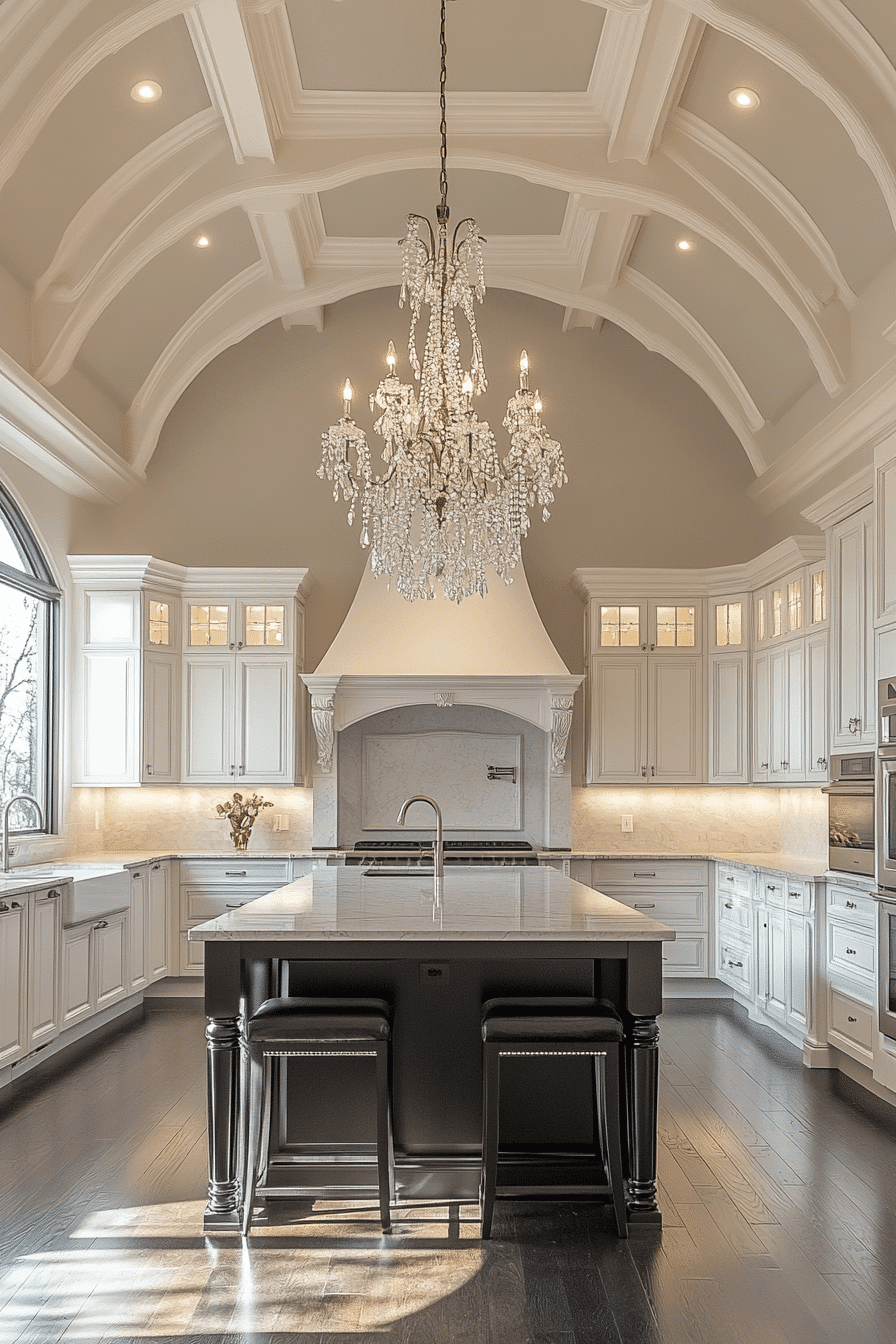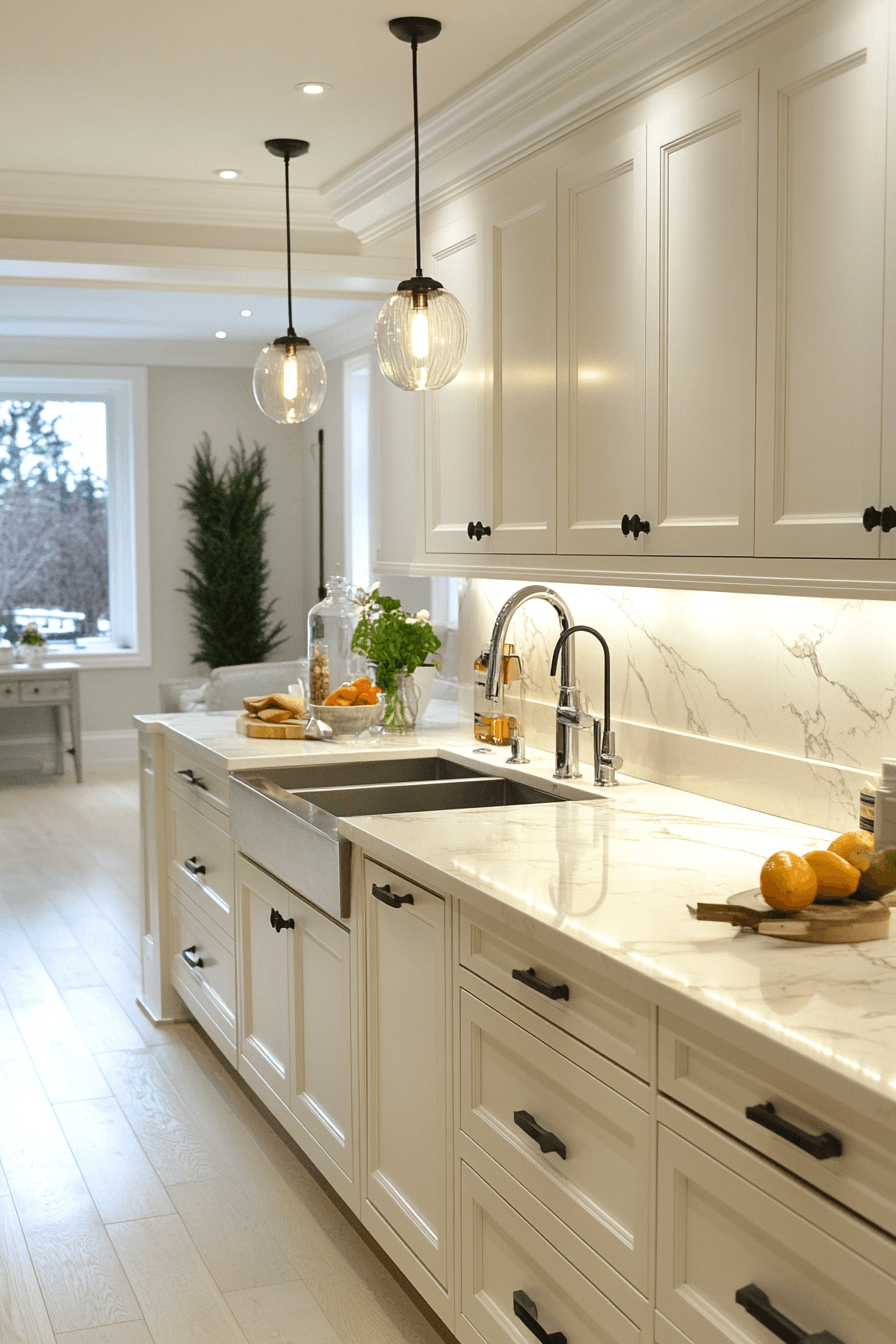 Crystal pendants enhance brightness while adding a refined sparkle across the space. Light reflects beautifully through faceted surfaces. Kitchen lighting ideas like this bring elegance into everyday spaces. Positioned strategically, they draw natural attention. The overall look feels polished. Add sparkle to your lighting setup.