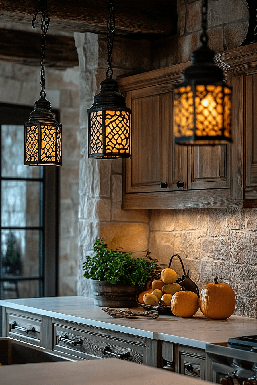 Vintage-inspired lantern fixtures add warmth and charm through textured materials and soft glow. Light feels cozy and welcoming throughout the space. Kitchen lighting ideas like this suit rustic or farmhouse designs perfectly. Wood and metal elements add character. The atmosphere feels relaxed and inviting. Bring charm into your lighting design.